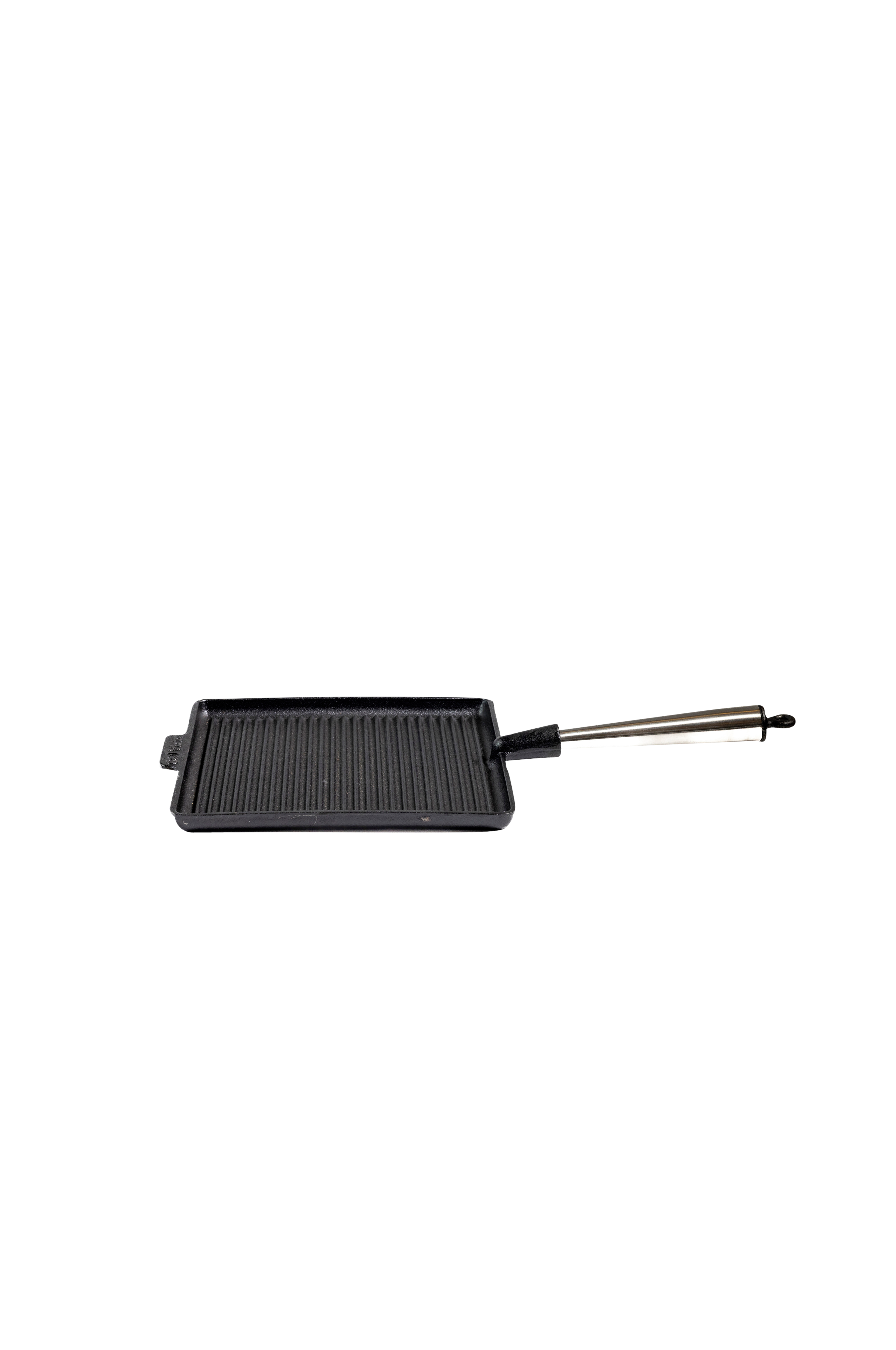 Grillpanne i støpejern med håndtak av stål. Firkantet design som utnytter grillflaten, med lave sider som gjør det lett å komme til. Kan brukes på alle komfyrer (inkludert induksjon).