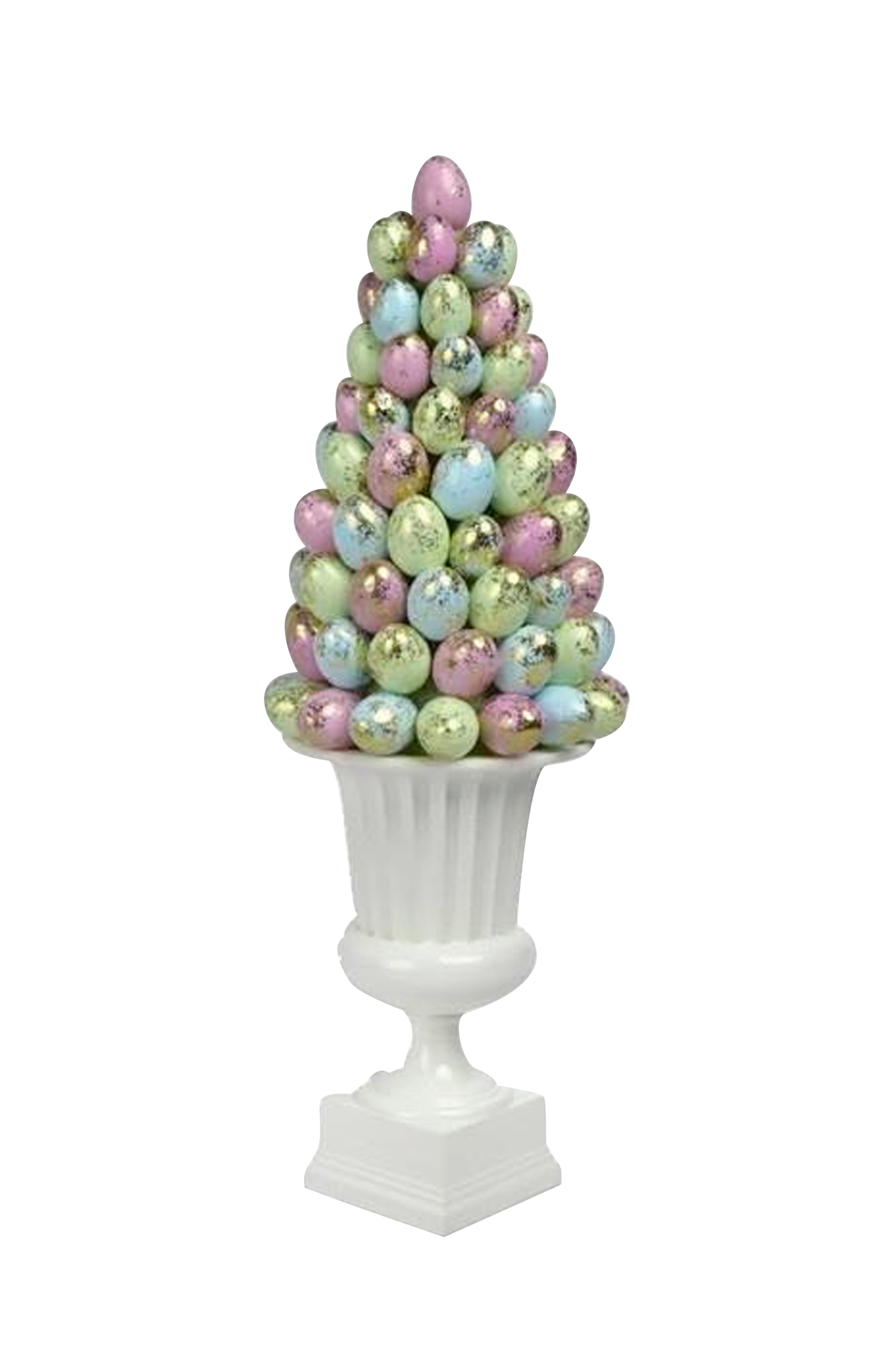 fin dekor med egg i herlige farger pudret med gullstoff i en stilren hvit krukke.