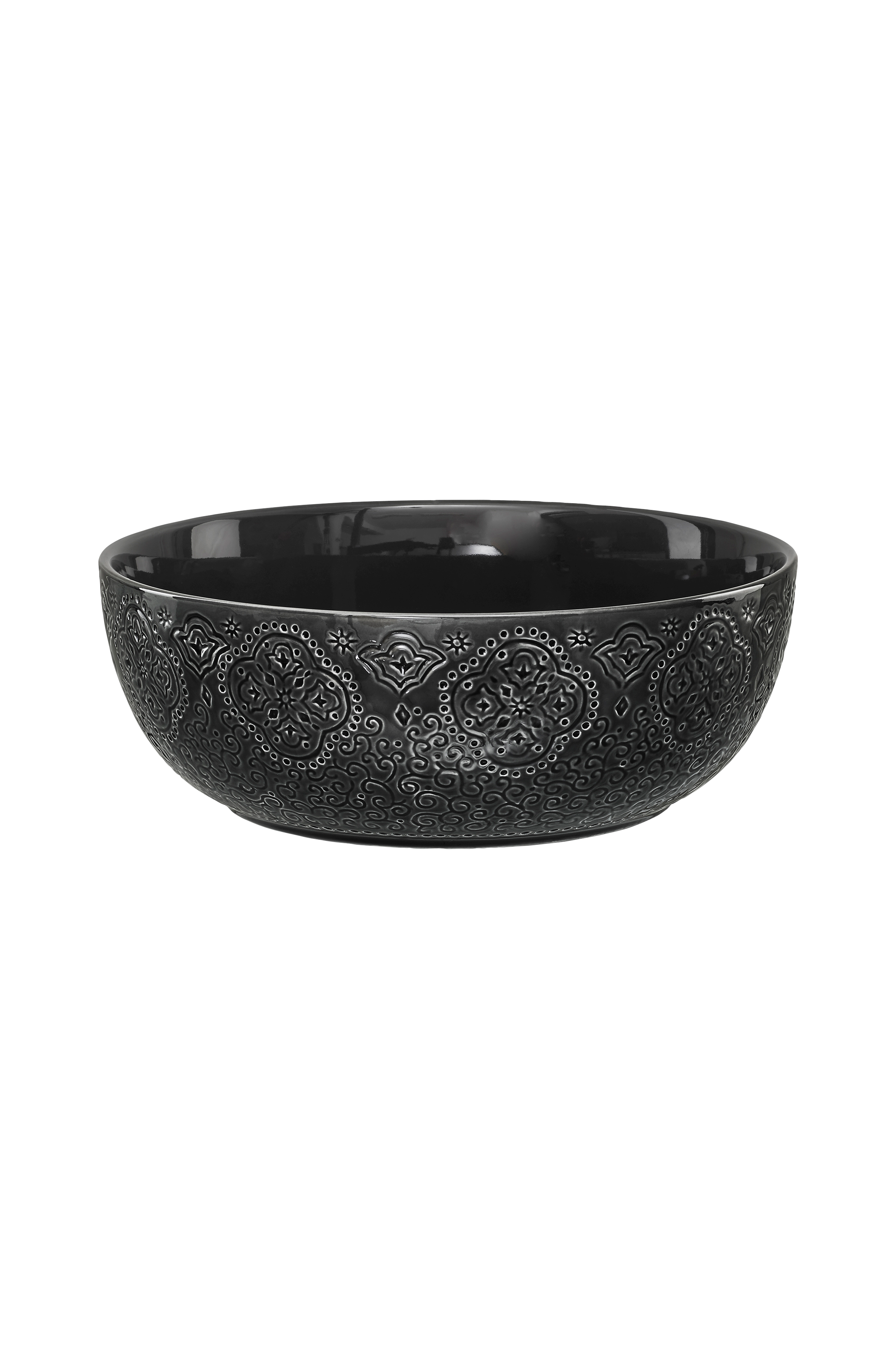 Skålformet tallerken med lav kant. Skålen er produsert av solid steintøy med vakkert relieffmønstret utside og glatt innside. Tåler mikrobølgeovn, ovn og oppvaskmaskin. Designet av Marita Lord.