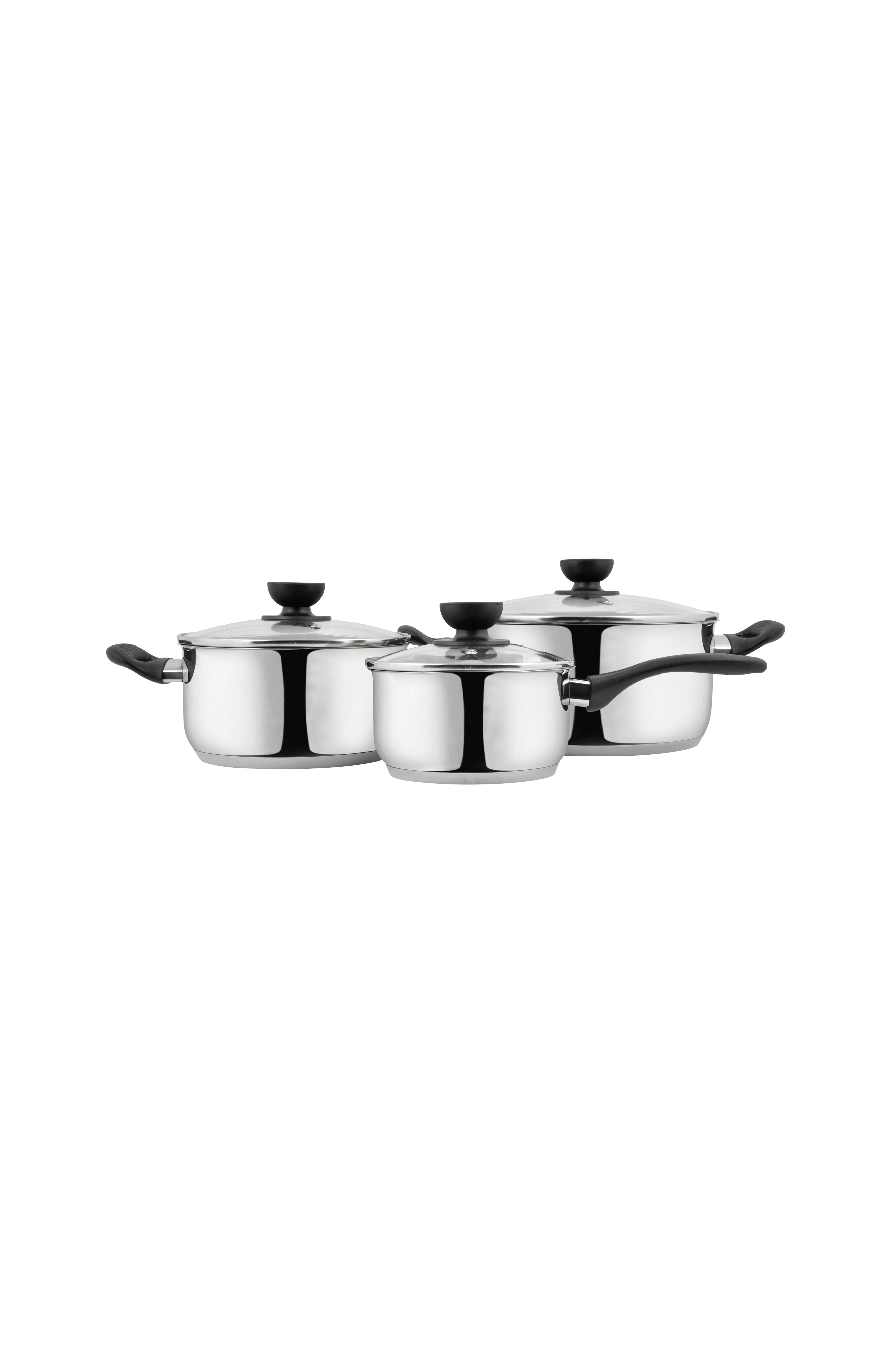 Sett med gryter i forskjellige størrelser. Leveres med bakelitt varmebestandige håndtak, glasslokk, damphull med mer. Alle grytene har innvendig måleindeks.