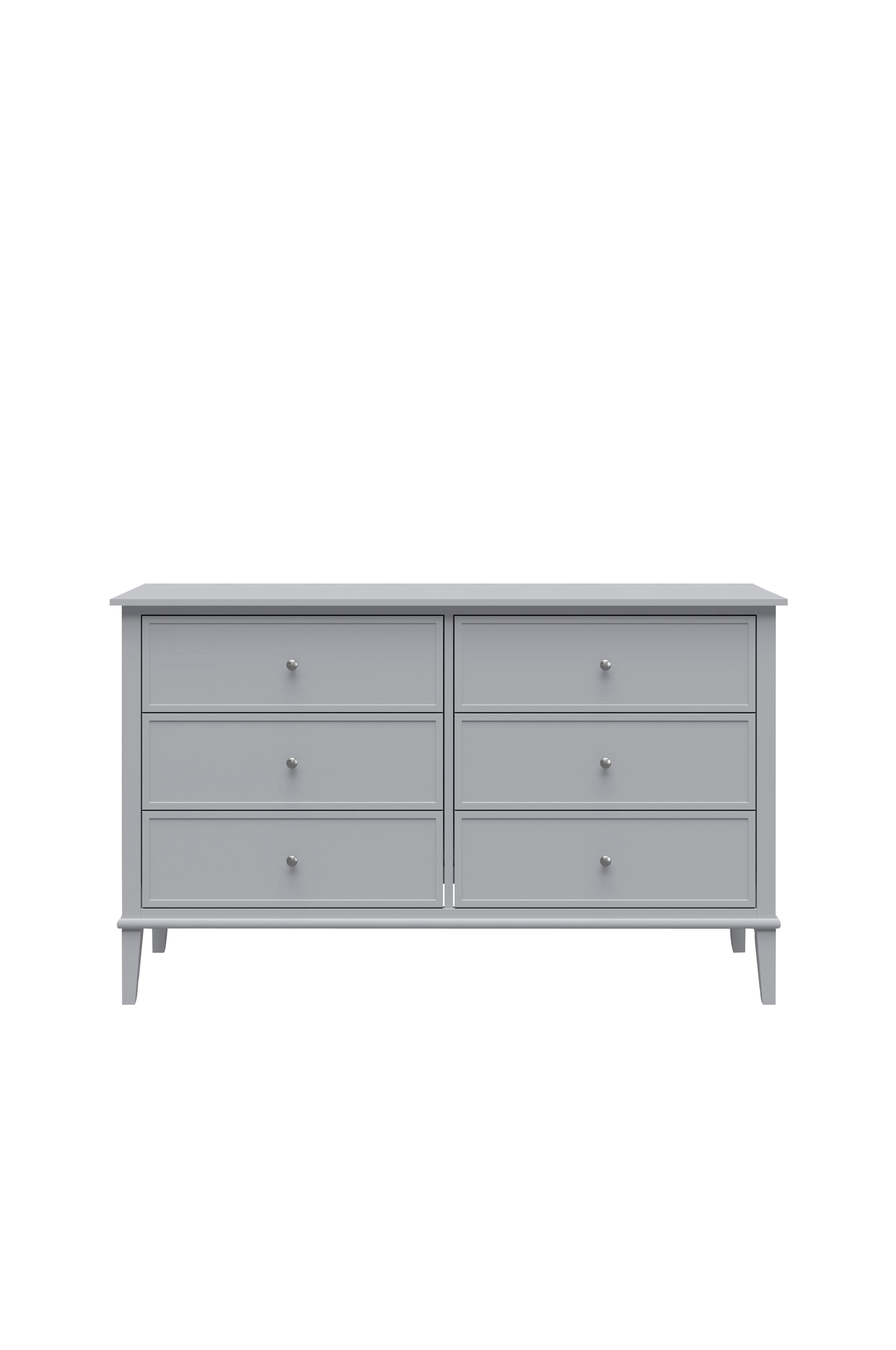 Oppgrader soverommet med kommoden Franklin 6 Drawer Dresser. Den er produsert av MDF som er malt i en vakker, klassisk og tidløs nyanse, og passer inn i alle interiørstiler. De seks skuffene rommer klær og sengetøy slik at du kan holde soverommet ryddig. Skuffene glir på solide metallskinner, og innsiden har glatt finish som gjør at klærne ikke hekter seg fast i skarpe kanter. Det medfølger et sett for å feste møbelet trygt mot veggen. Kommoden leveres i en flat pakke og må monteres. Vi anbefaler at to voksne monterer produktet. Montert måler kommoden H85 x B140 x D41 cm.
