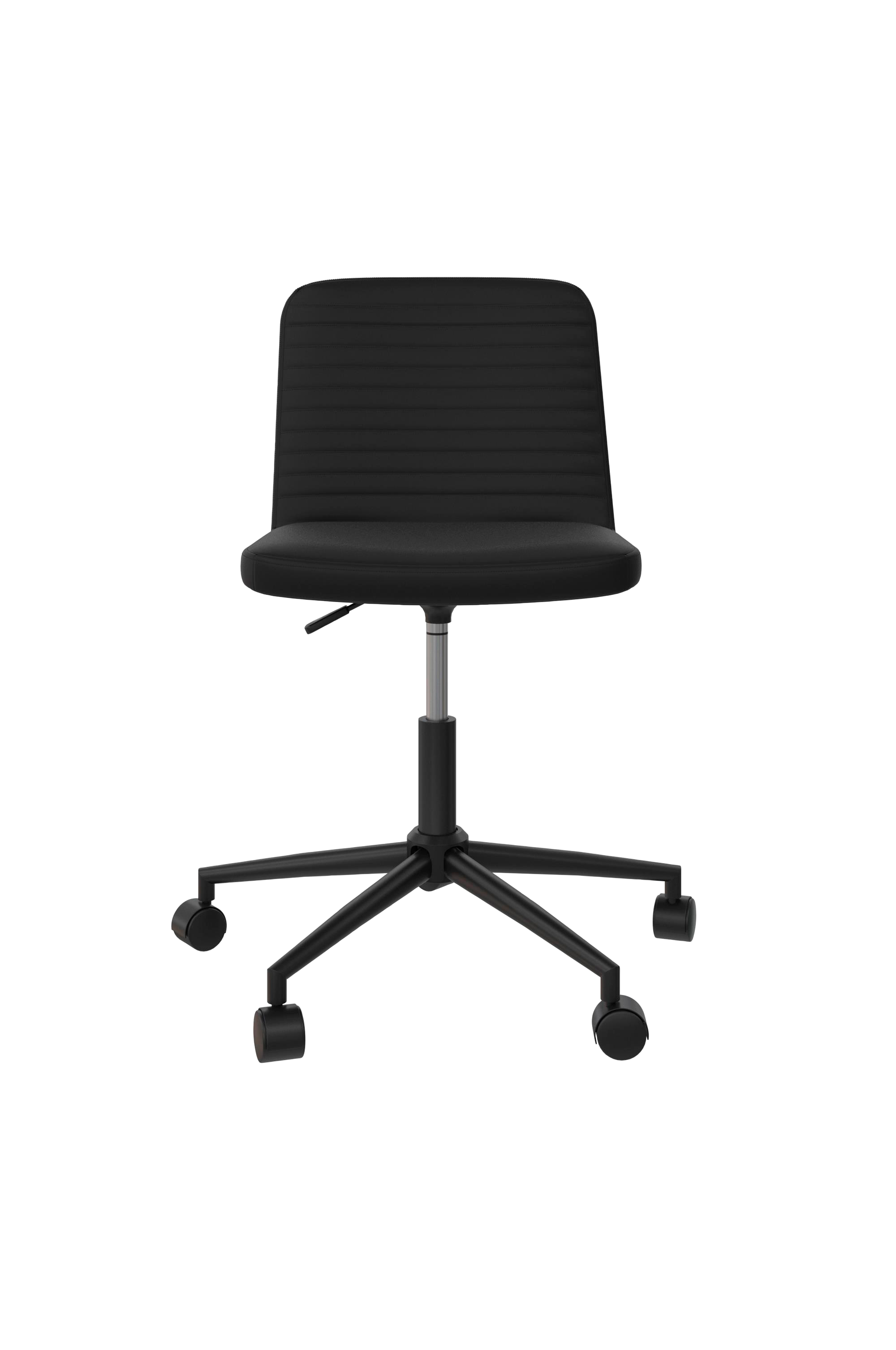 Moderne, armløs kontorstol trukket i et stilig stoff med horisontal tufting på ryggen. Et perfekt supplement til hjemmekontoret.