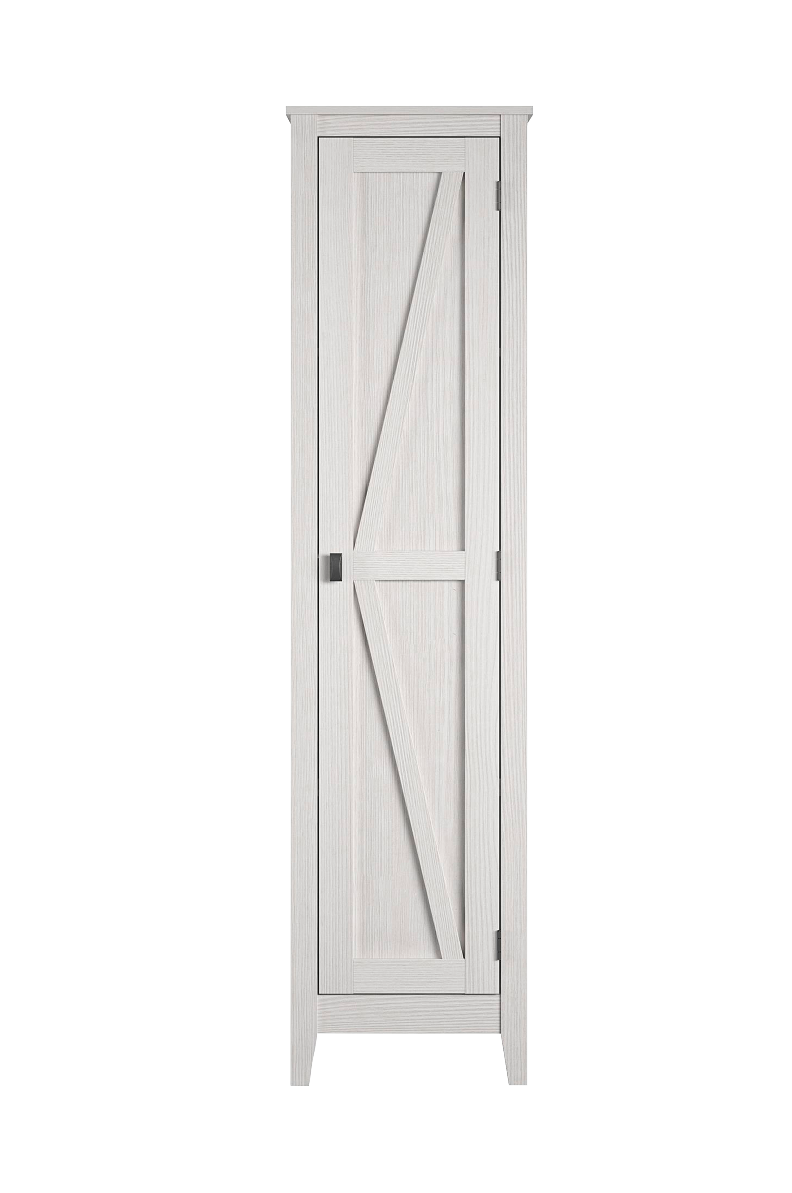 Skap Farmington fra Systembuild Evolution er en lekker løsning på dine oppbevaringsbehov. Den rustikke designen, som minner om en låvedør, og de avsmalnende bena, skaper en patinert, antikk look, men skapet er produsert av stabil laminert sponplate og MDF. Perfekt til oppbevaring av kontormateriell, sengetøy, tørrvarer med mer! Bak døren er det fire romslige hyller (hvorav to er justerbare). Den elfenbenshvite, trelignende finishen gir hjemmet en rustikk touch. Vi anbefaler at skapet monteres og flyttes av to voksne. Det medfølger et sett for å feste møbelet trygt mot veggen. Etter montering måler skapet H183 x B46 x D40 cm.