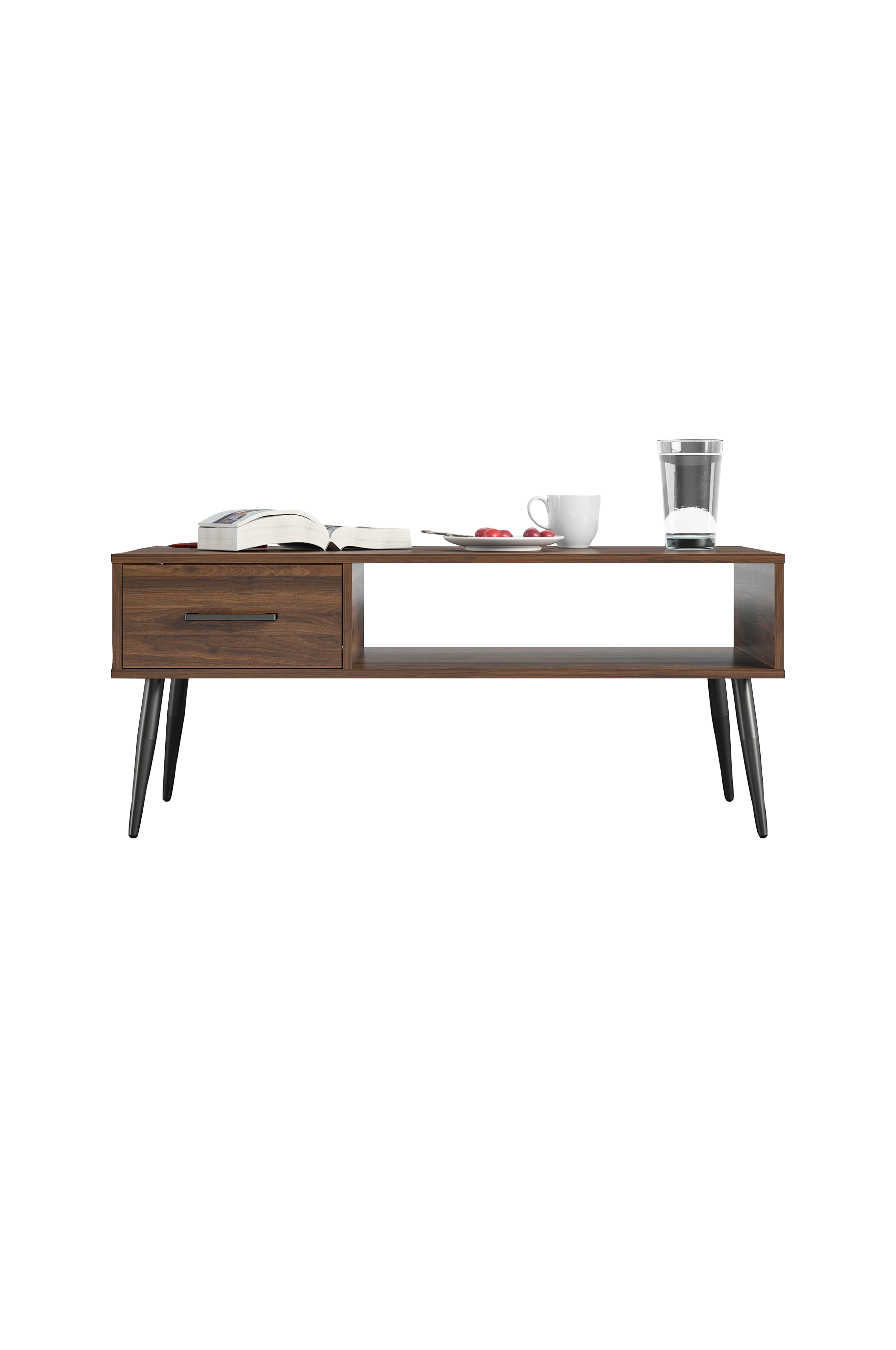 Sidebordet Wilson Coffee Table gir stua en moderne retrotouch. Det er produsert av laminert sponplate med klassisk trelignende finish. Den store bordplaten er perfekt for fjernkontroll, snacks og dekor. På den åpne hylle under bordplaten kan du legge bøker og magasiner eller elektronikk. Skuffen passer perfekt til småting, ledninger og ladere. Sofabordet leveres i en flat pakke og krever montering. Vi anbefaler at to voksne monterer produktet. Etter montering måler sofabordet H46 x B107 x D50 cm.