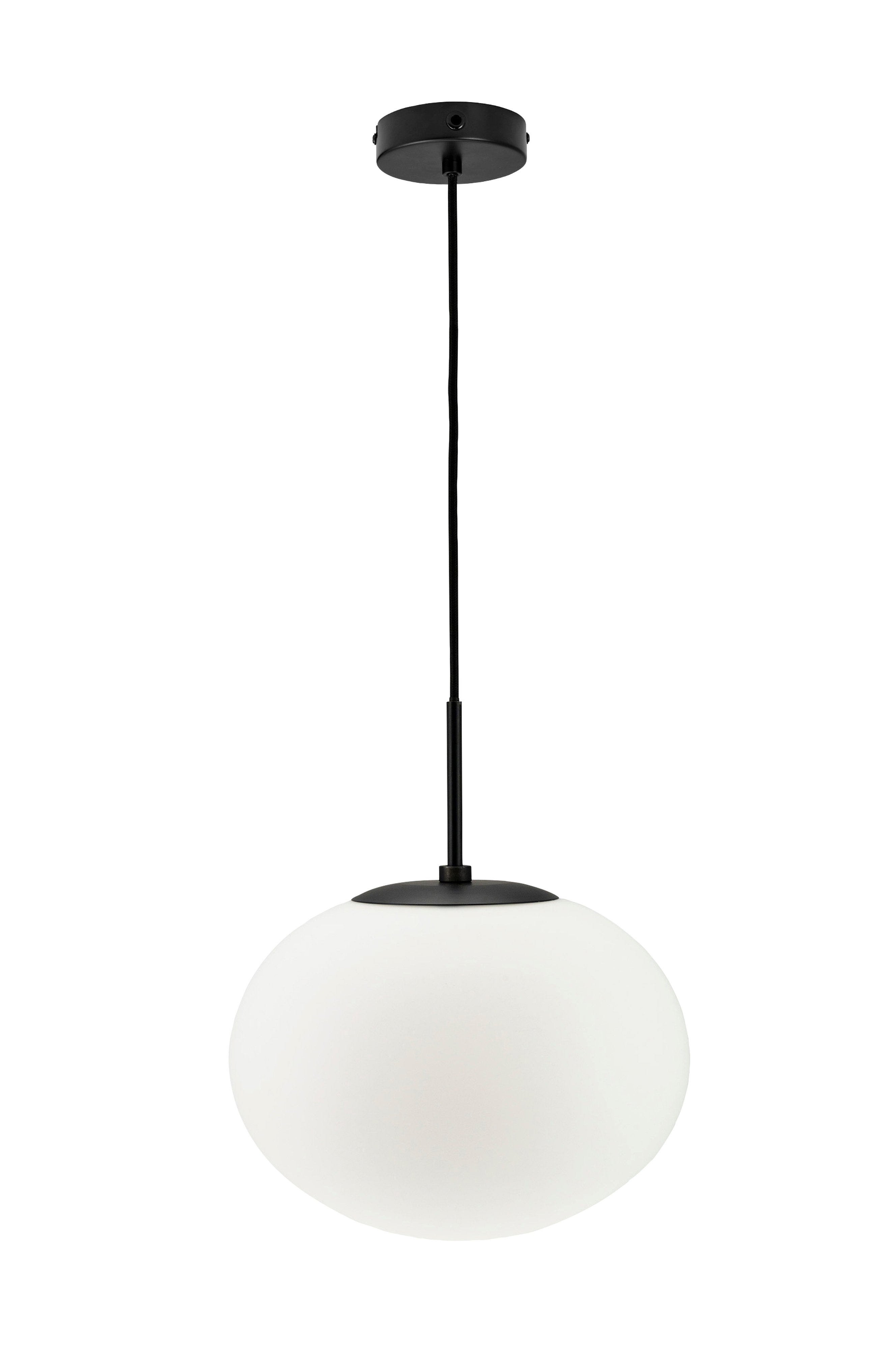 Prinsessependelen er laget av hvitt opalglass og har et svart oppheng. Lampen har en oval form