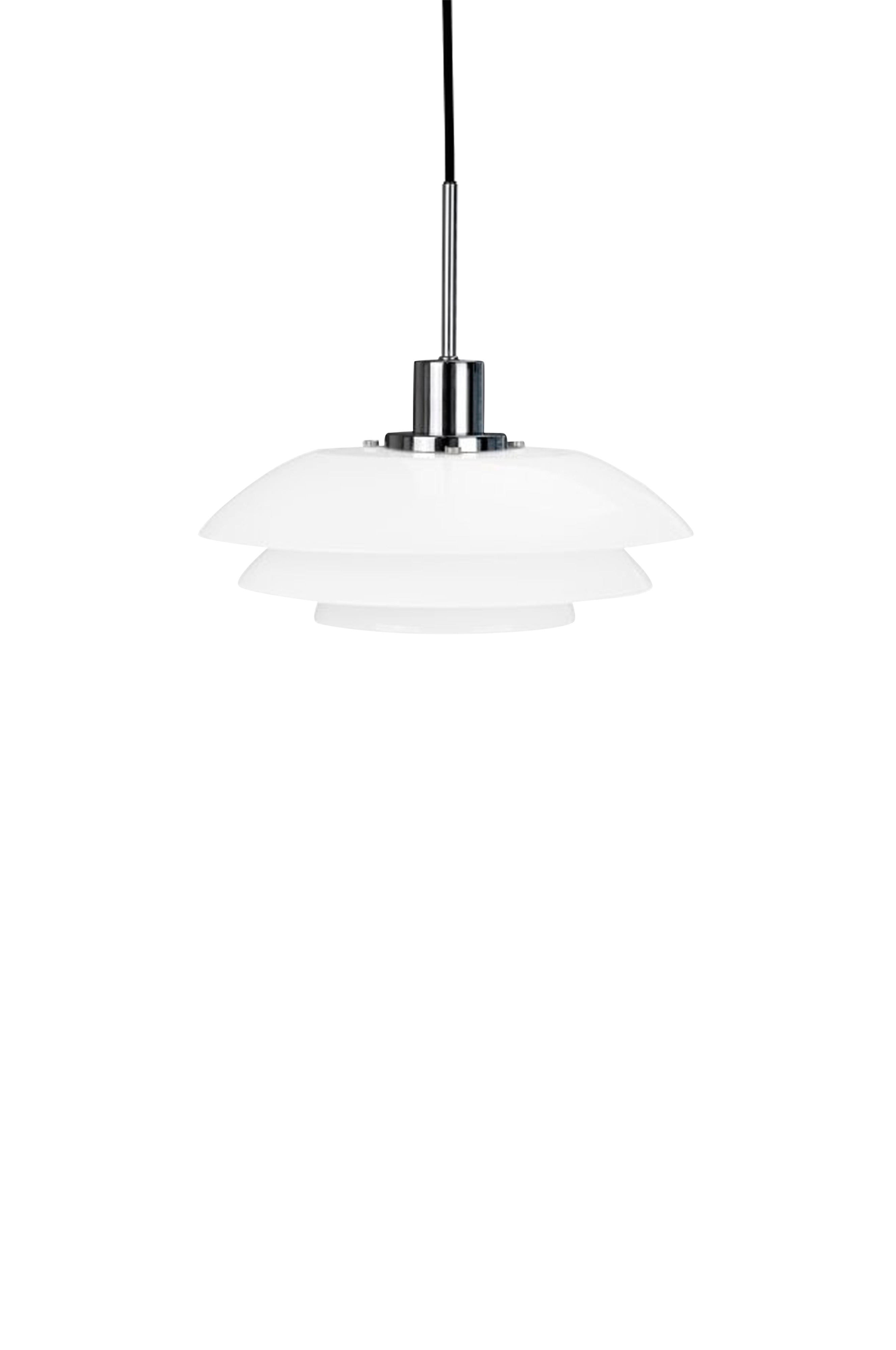 Seriens lamper kombinerer det myke med det skarpe i uttrykket takket være de skarpe og rene linjene, som harmonerer vakkert med alle stiler og lar et ikonisk element skinne vakkert lys. Lyset ledes mykt gjennom tre lagdelte skjermer i varierende størrelser, noe som skaper en varm og innbydende atmosfære uten å blende. Takket være den gjennomtenkte plasseringen av lampeskjermene gir lampen funksjonell belysning samtidig som den gir et koselig og blendingsfritt lys. Pendelen leveres med en 3 meter lang stoffledning.
