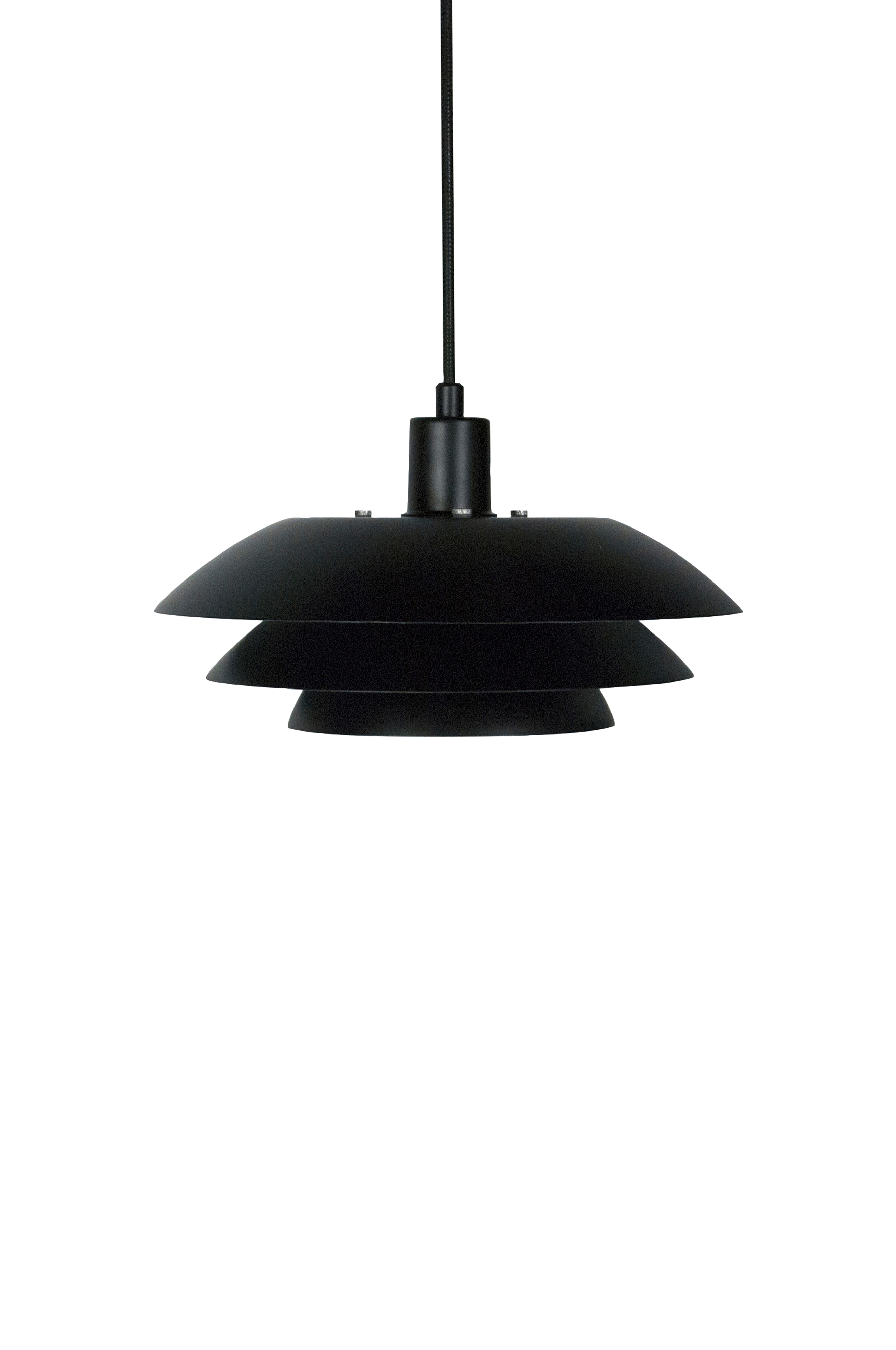 Seriens lamper kombinerer det myke med det skarpe i uttrykket takket være de skarpe og rene linjene, som harmonerer vakkert med alle stiler og lar et ikonisk element skinne vakkert lys. Lyset ledes mykt gjennom tre lagdelte skjermer i varierende størrelser, noe som skaper en varm og innbydende atmosfære uten å blende. Takket være den gjennomtenkte plasseringen av lampeskjermene gir lampen funksjonell belysning samtidig som den gir et koselig og blendingsfritt lys. Pendelen leveres med en 3 meter lang stoffledning.