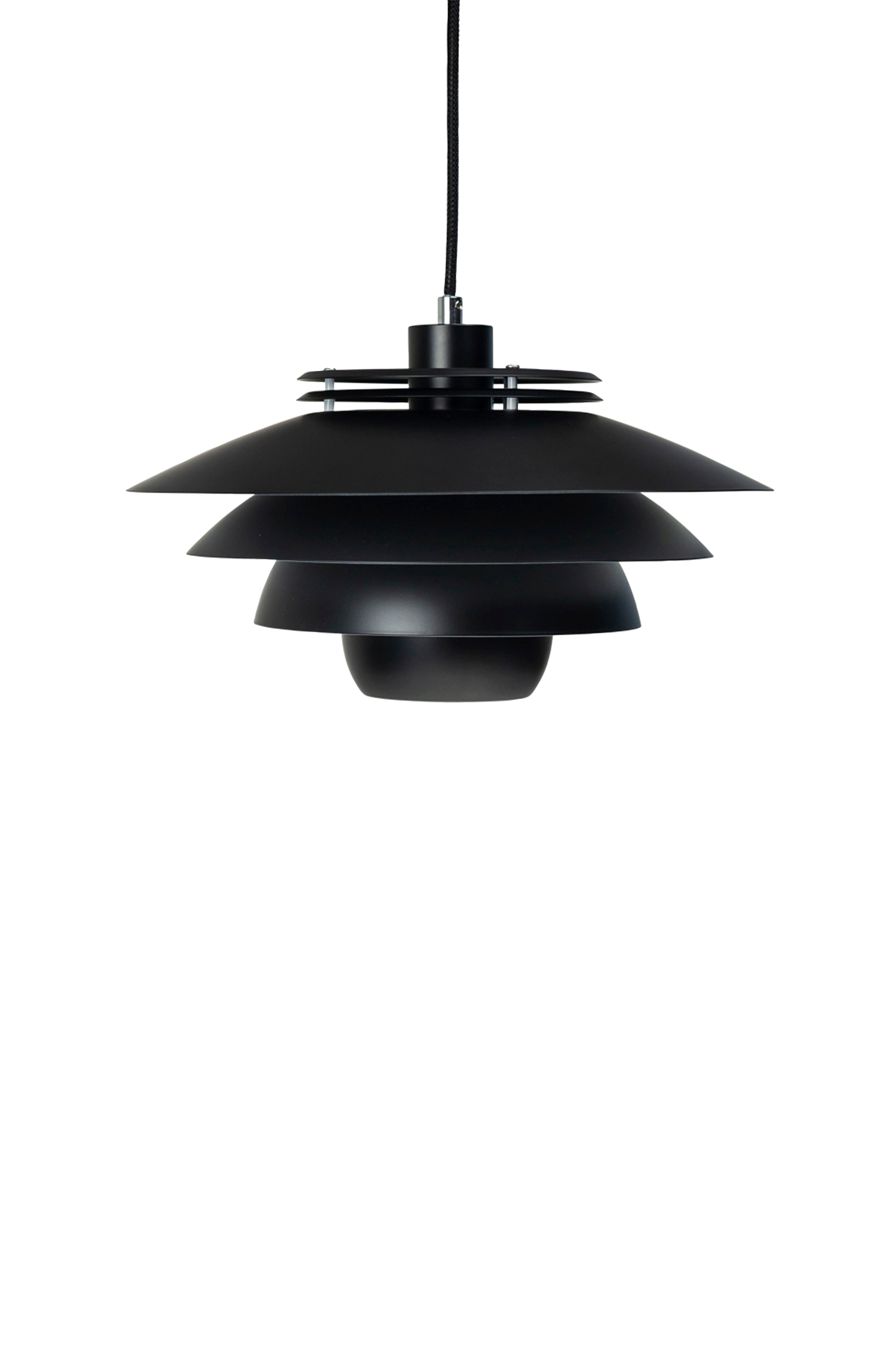 De fire nøye lagdelte lampeskjermene gir en myk og jevn lysfordeling, noe som gjør den til et ideelt valg over spisebord eller i oppholdsrom der både stemning og klarhet er viktig.