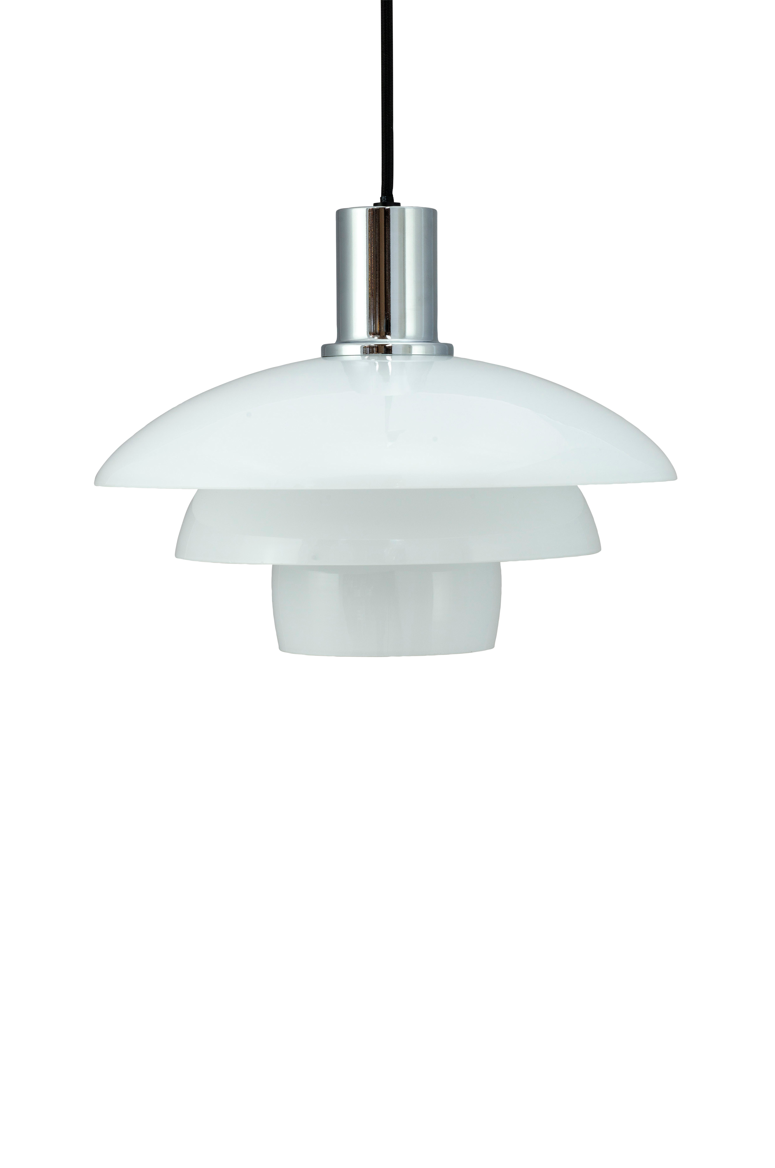 Morph pendellampe i opalglass og kromoppheng. Vakker pendellampe fra danske Dyberg Larsen som skaper en klassisk og vakker nordisk stil i mange av hjemmets rom. Skjermene monteres etter at fatningshodet er montert gjennom toppskjermen. Lampen leveres med en 3 meter lang stoffledning.