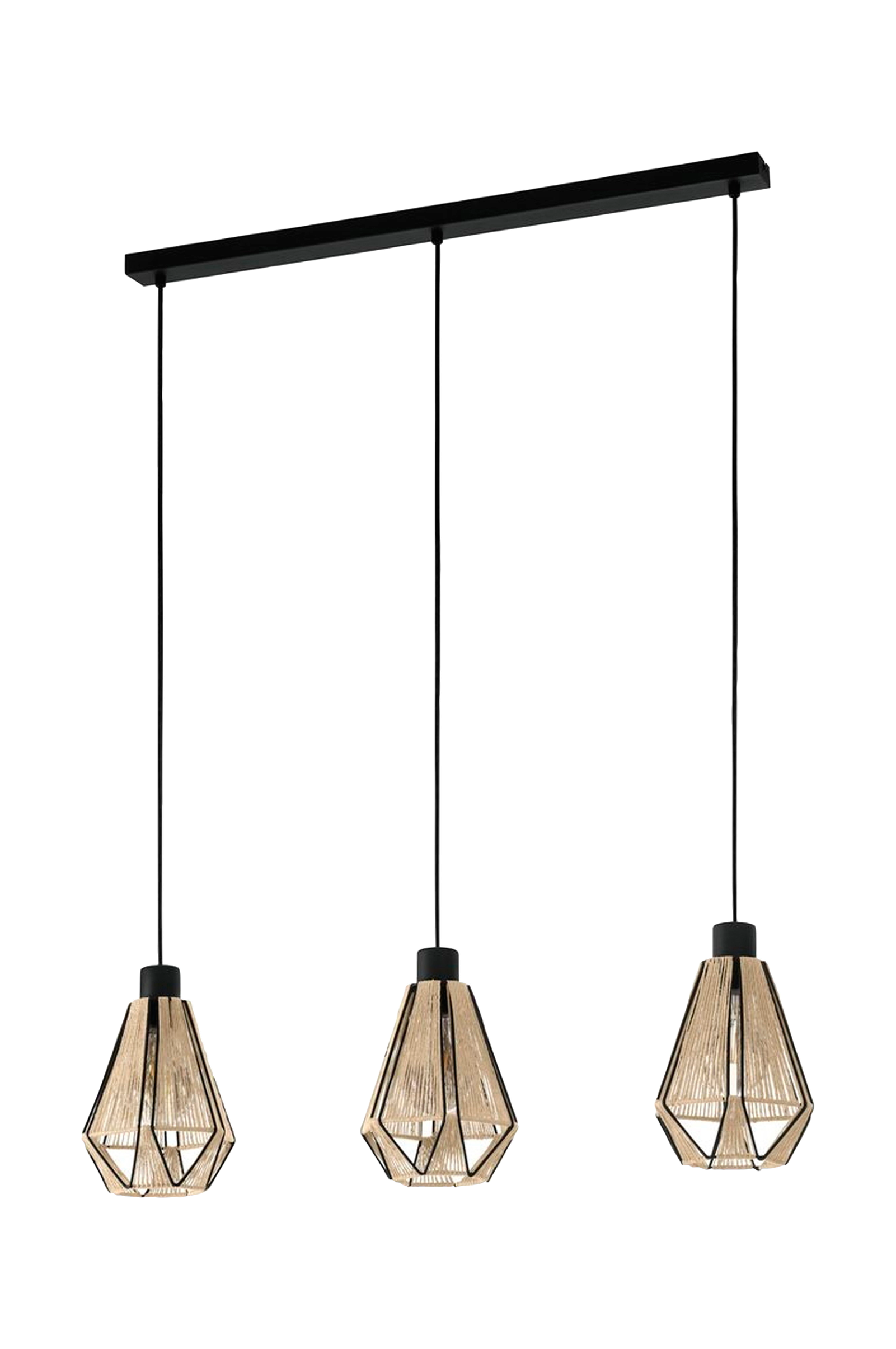 adwickle pendellampen har tre diamantformede lampeskjermer laget av delikat svart ståltråd omviklet with naturlig hampegarn. Lampeskjermene er opphengt i en lang, svart baldakin. Når lyset er på, skaper det et fascinerende spill av lys og skygge gjennom de geometriske lampeskjermene. With Den moderne blandingen av metall og naturmaterialer gjør pendellampen til en stilfull belysning i ethvert rom, enten det er i stuen eller i spisestuen over spisebordet. Den avbildede glødepæren er ikke inkludert. Produktet har e27-fatning og krever e27-pærer.