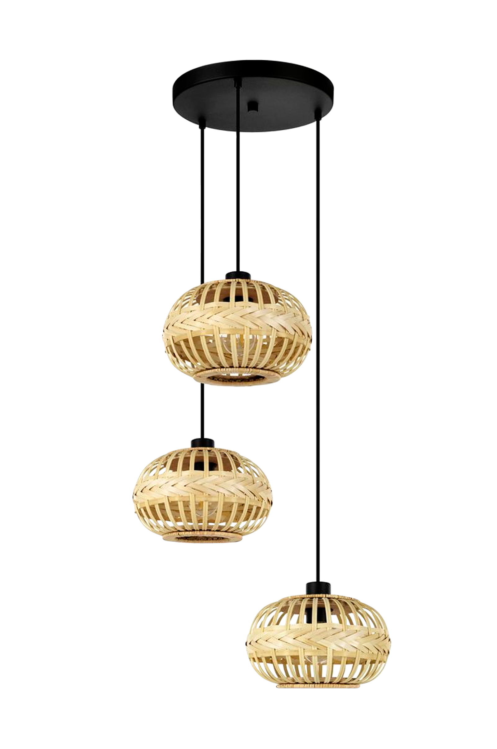 amsfield 1 pendellampen har tre round lampeskjermer laget av brun bambusflet sammen with et round svart metallfeste. De flettede lampeskjermene er hengt i ulike høyder, noe som skaper et fascinerende spill av lys og skygge på veggen. Pendellampen passer sømløst inn i with scandi-interiør, så vel som i dagens vintage- og bohotrender. Produktet gir en koselig belysning i alle rom, enten det er på kjøkkenet, i stuen eller over et round bord i spisestuen. De avbildede glødepærene er ikke inkludert. Produktet har e27-fatning og krever e27-pærer.