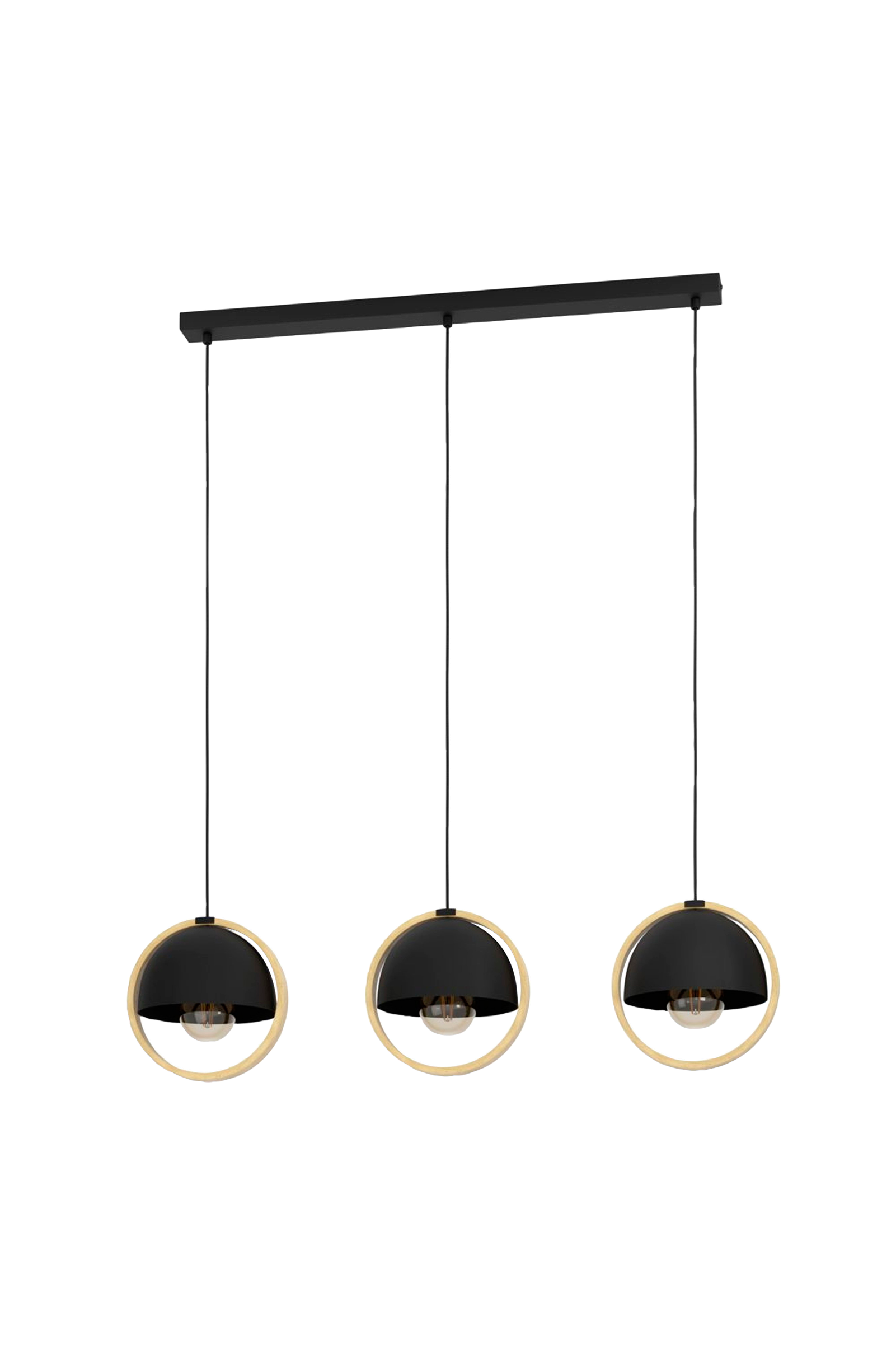 callow pendellampen har tre runde lampeskjermer i svart stål, hver omgitt av en ring i naturlig tre. Lampeskjermene henger i svarte tekstilkabler fra en forlenget metallbaldakin i samme farge. Med sin minimalistiske, men likevel karakteristiske design gir pendellampen stilfull belysning til ethvert moderne interiør, enten det er i stuen eller over spisebordet. Produktet har e27-fatning og krever 3 x e27-pærer, som ikke er inkludert.