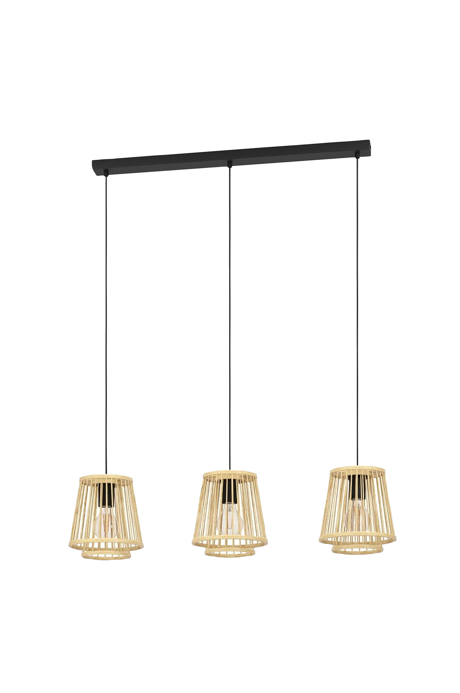 hykeham pendellampen har tre lampeskjermer, hver laget av to naturlige bambusskjermer som er lagt inn i hverandre. Lampeskjermene er hengt opp i tre svarte tekstilkabler fra en langstrakt baldakin i samme farge. Når lampeskjermene er slått på, skaper bambuslamellene som lampeskjermene består av, et fascinerende spill av lys og skygge i taket. Pendellampen føyer seg sømløst inn with i tidens natur- og boho-trender, skaper en tiltalende atmosfære with de naturlige materialene og gir en koselig belysning i stuen eller spisestuen. Produktet har e27-fatning og krever tre e27-pærer, som ikke er inkludert.