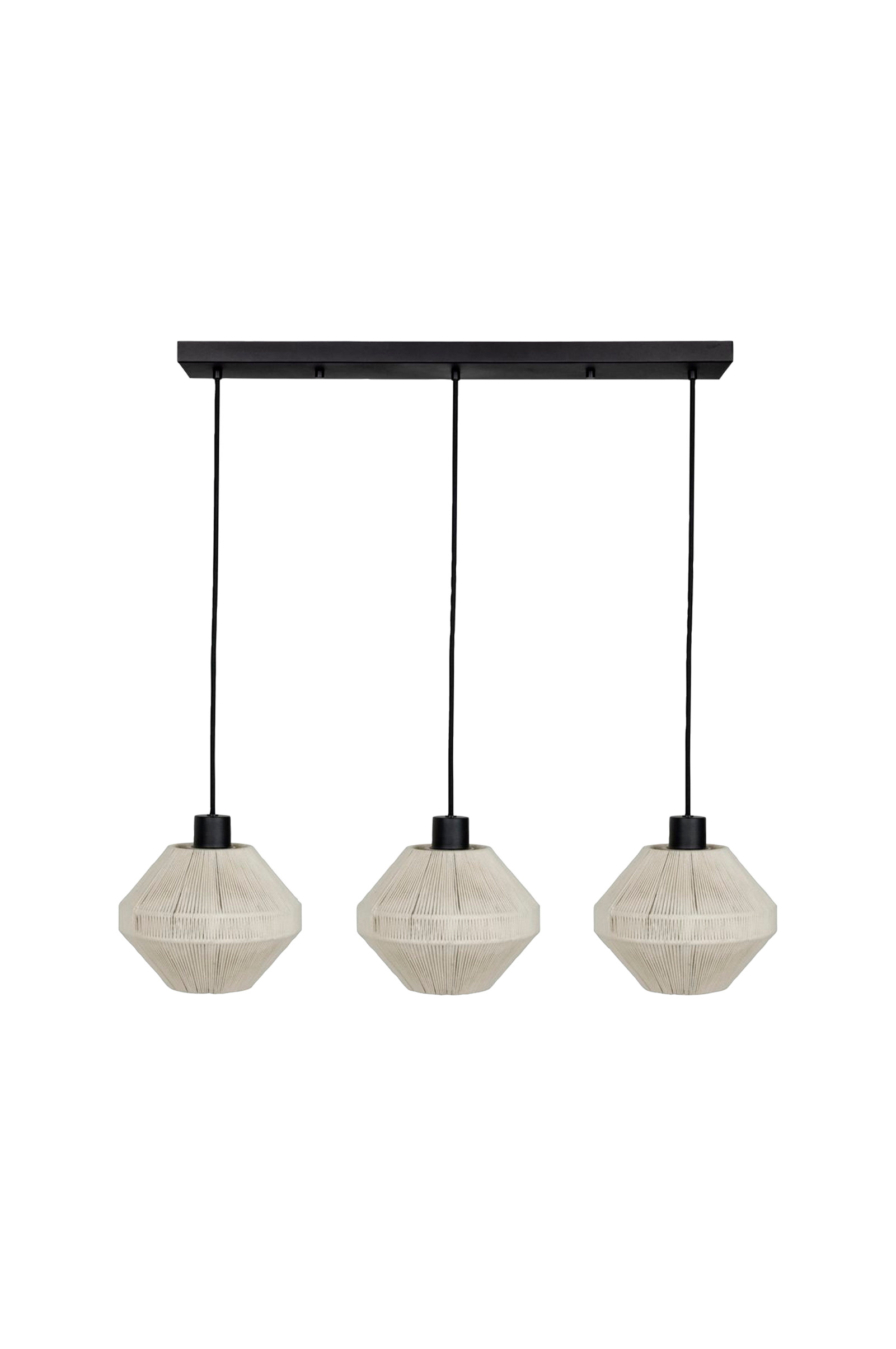 Denne midsumer hengelampen er laget av en svart stålbjelke, svart stoffkabel og tre lampeskjermer i vevd, oval stoffform. Lampen krever tre e27-lyskilder for å lyse, og bjelken er 72 cm lang og har en justerbar høyde på 110 cm.