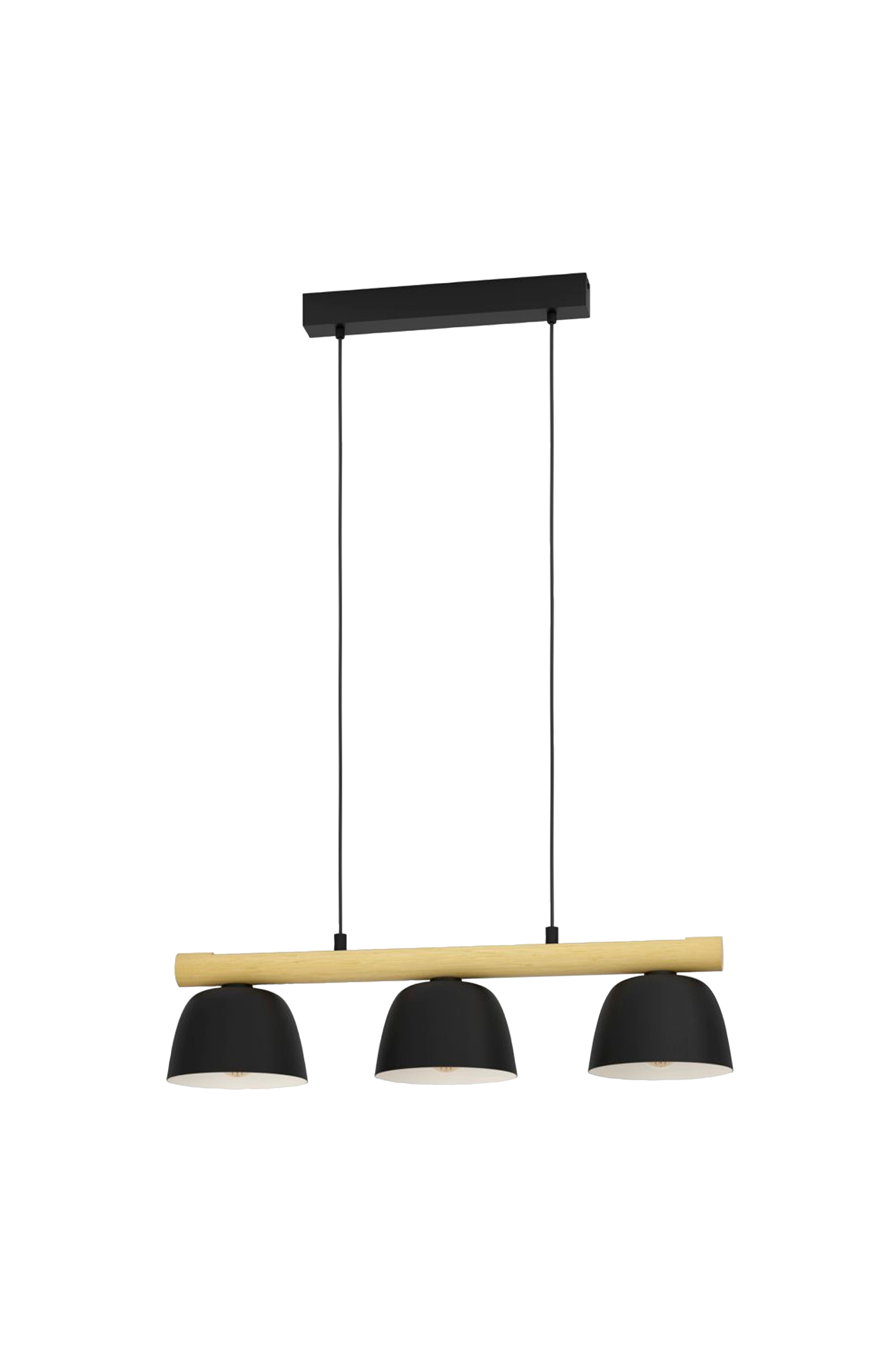 sherburn pendellampen har en svart metallbaldakin og et langt, brunt tverrstykke i tre som er hengt opp med tre svarte metallskjermer med hvite innerflater. De hvite innvendige flatene gir en effektiv belysningsløsning. Pendellampens tiltalende kombinasjon av gummitre og metall gjør at produktet passer inn i ulike interiørstiler og gir moderne belysning i stuen eller over spisebordet. De avbildede glødepærene er ikke inkludert. Produktet har e27-fatning og krever e27-pærer.