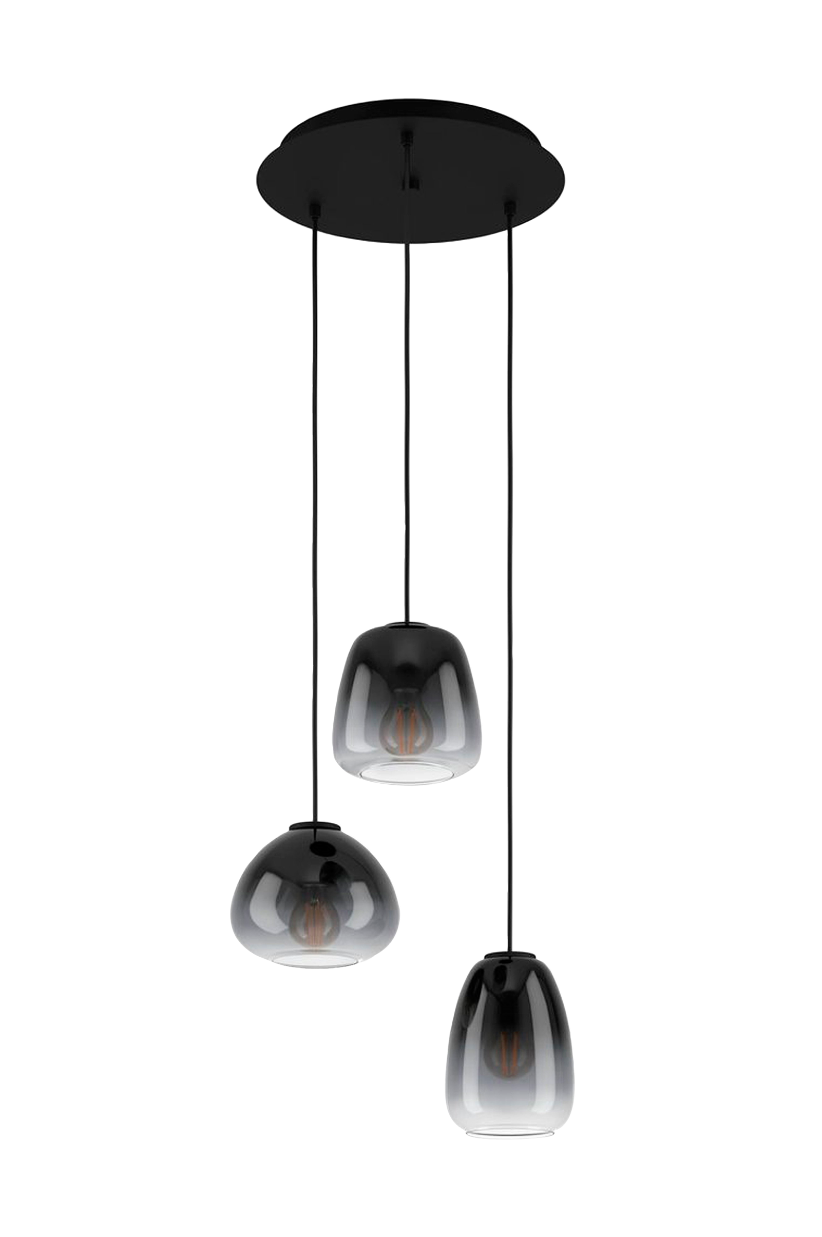 aguilares pendellampen har tre svakt buede, opphengte lampeskjermer i glass, hver med forskjellig design og fargeovergang fra svart til transparent. Lampeskjermene er hengt opp i ulike høyder på svarte tekstilkabler fra en oval baldakin i svart metall, noe som kompletterer lampens elegante uttrykk på en vakker måte. Pendellampen passer sømløst inn i moderne stilarter og skaper en karakteristisk belysning i stuen eller over bordet i spisestuen. De avbildede glødepærene er ikke inkludert. Produktet har e27-fatning og krever 3 x e27-pærer.