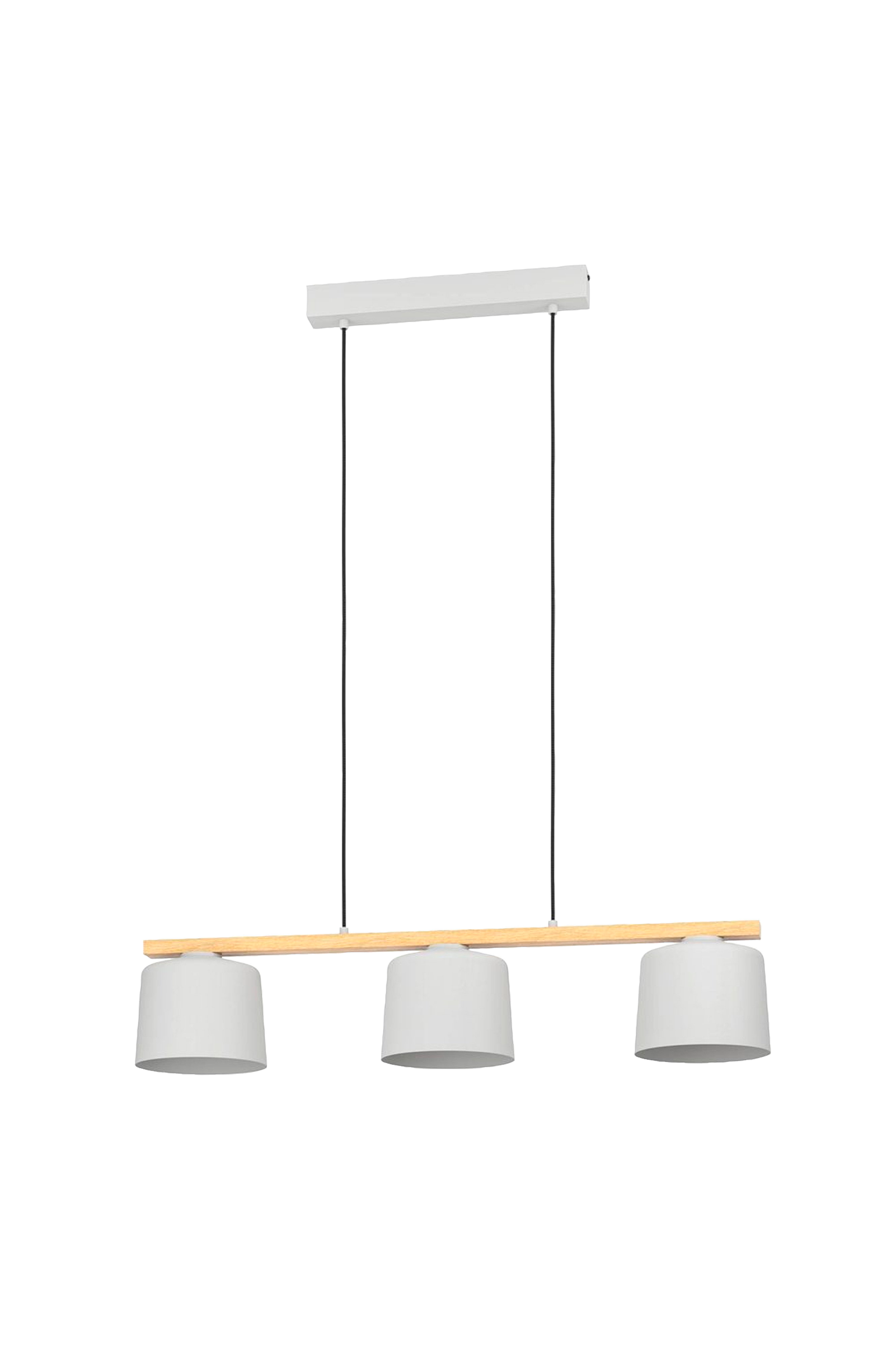 mariel pendellampen har et avlangt, brunt treelement og tre runde lampeskjermer i lysegrått stoff som henger fra en baldakin i metall. Pendellampen passer sømløst inn i moderne interiør, og med en blanding av tre- og stoffmaterialer gir den en koselig belysning i stuen eller over et langbord i spisestuen. Lyspærer er ikke inkludert. Produktet har e27-fatning og krever e27-pærer.