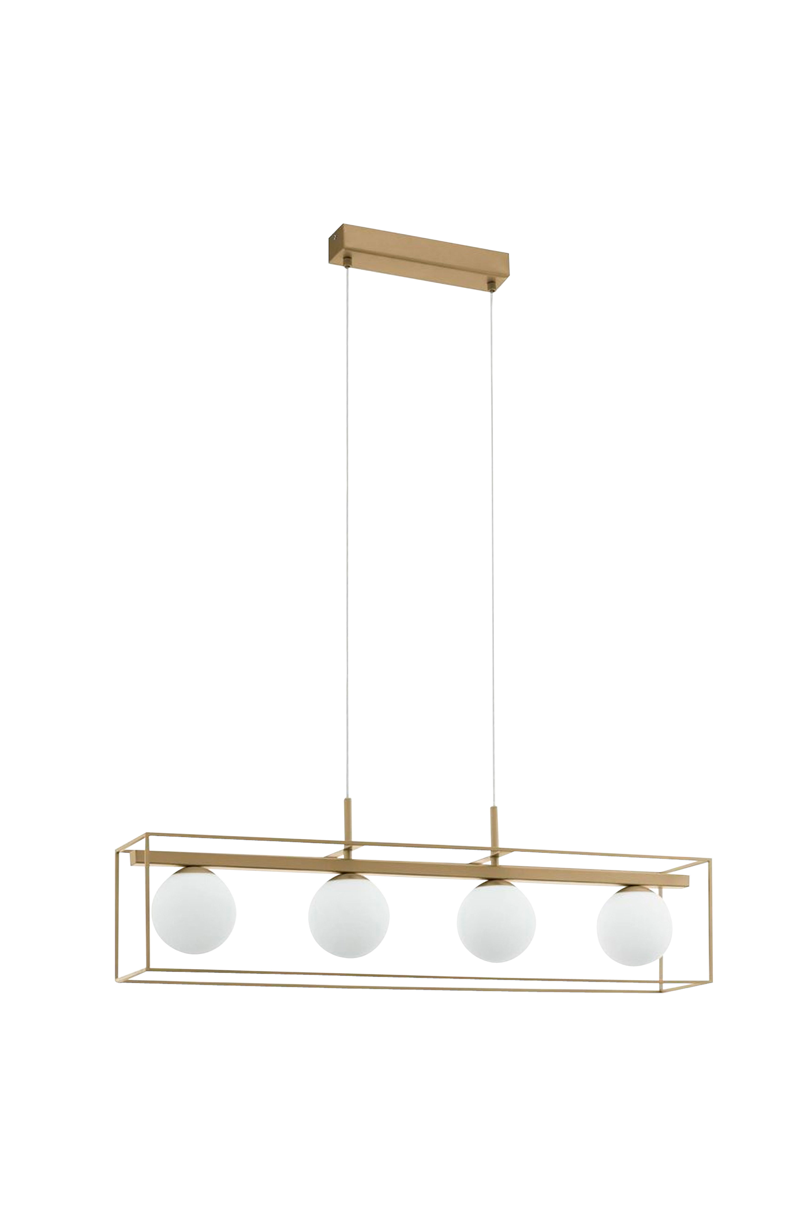 vallaspra pendellampen har en kubeformet metallramme i champagnefarget utførelse. Designet har fire kuler i matt hvitt opalglass. Pendellampen passer elegant inn i minimalistiske interiører og skaper en moderne belysning i stuen eller spisestuen over spisebordet. Lyspærer er ikke inkludert. Produktet har e14-fatning og krever e14-pærer.