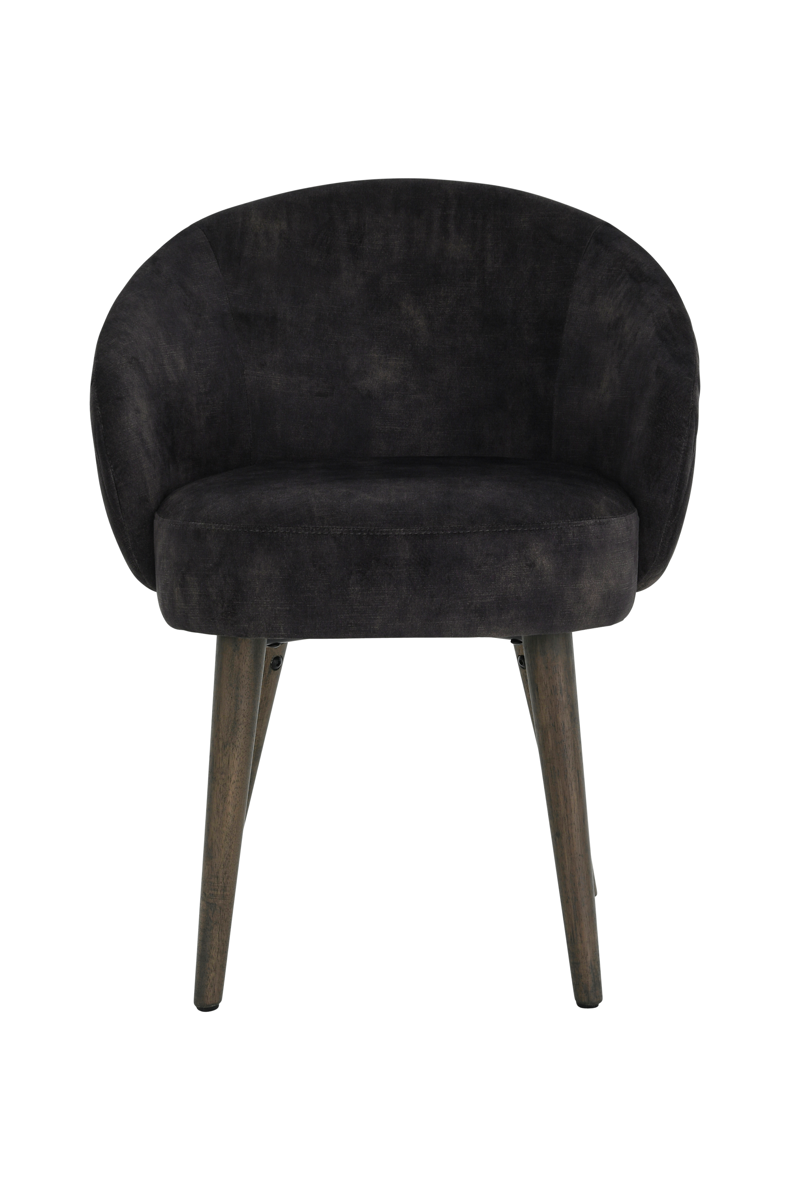 To armstoler med ben og stamme i gummitre. Trekk i melert fløyel med quiltet mønster på ryggens utside. Skumfyll. Enklere montering.