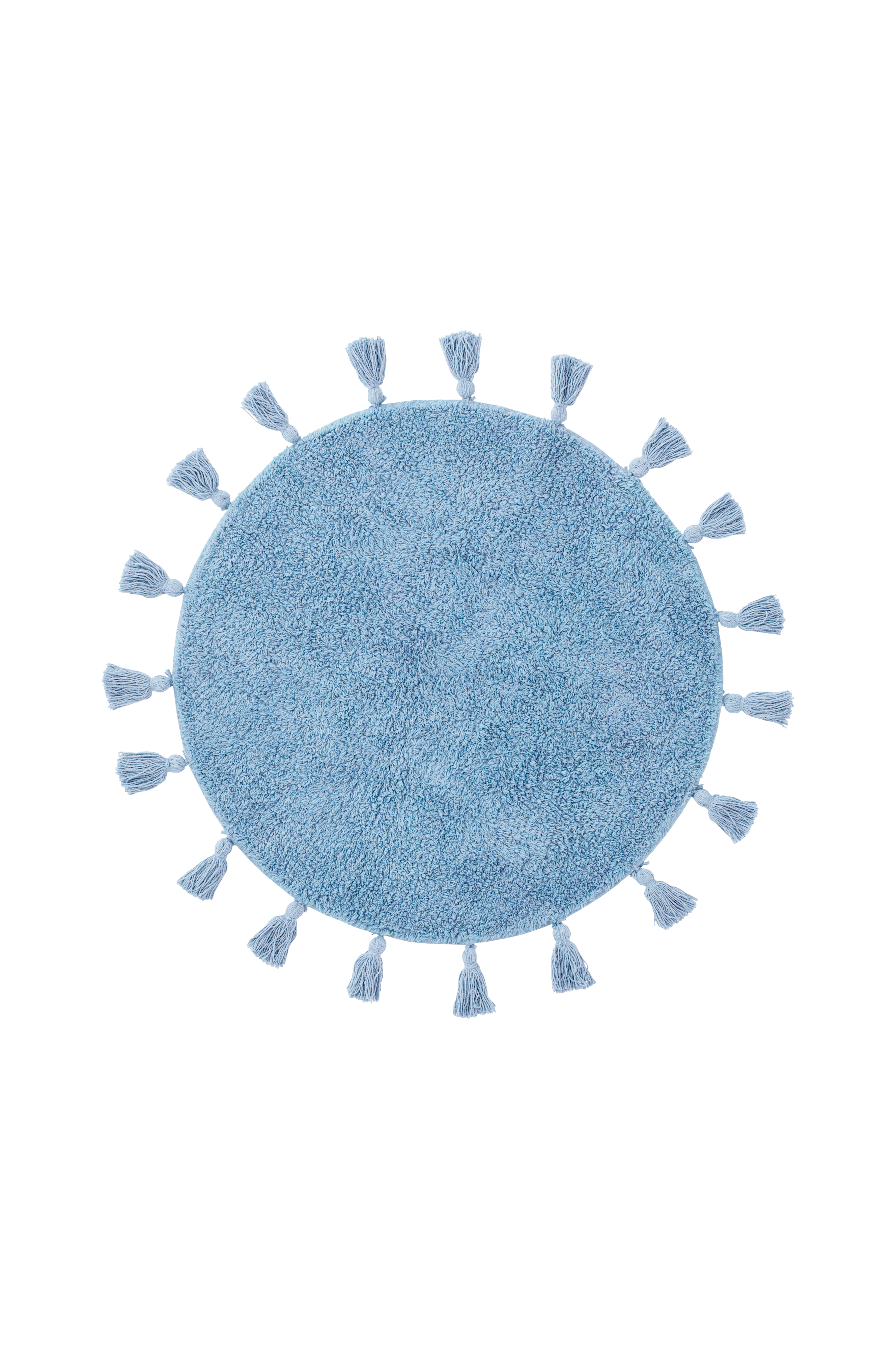 Rund, tuftet baderomsmatte i bomull med dusker rundt.