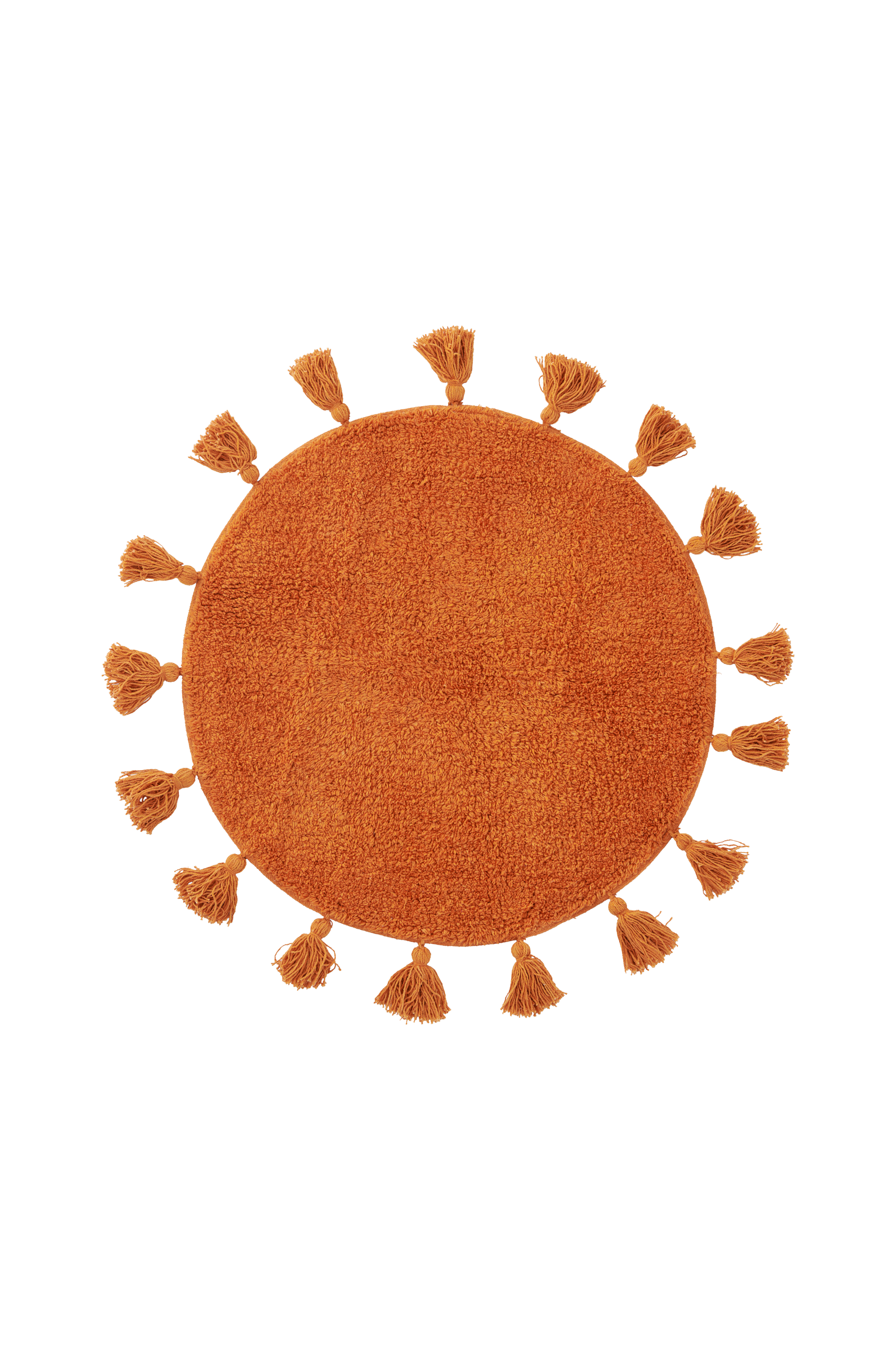 Rund, tuftet baderomsmatte i bomull med dusker rundt.
