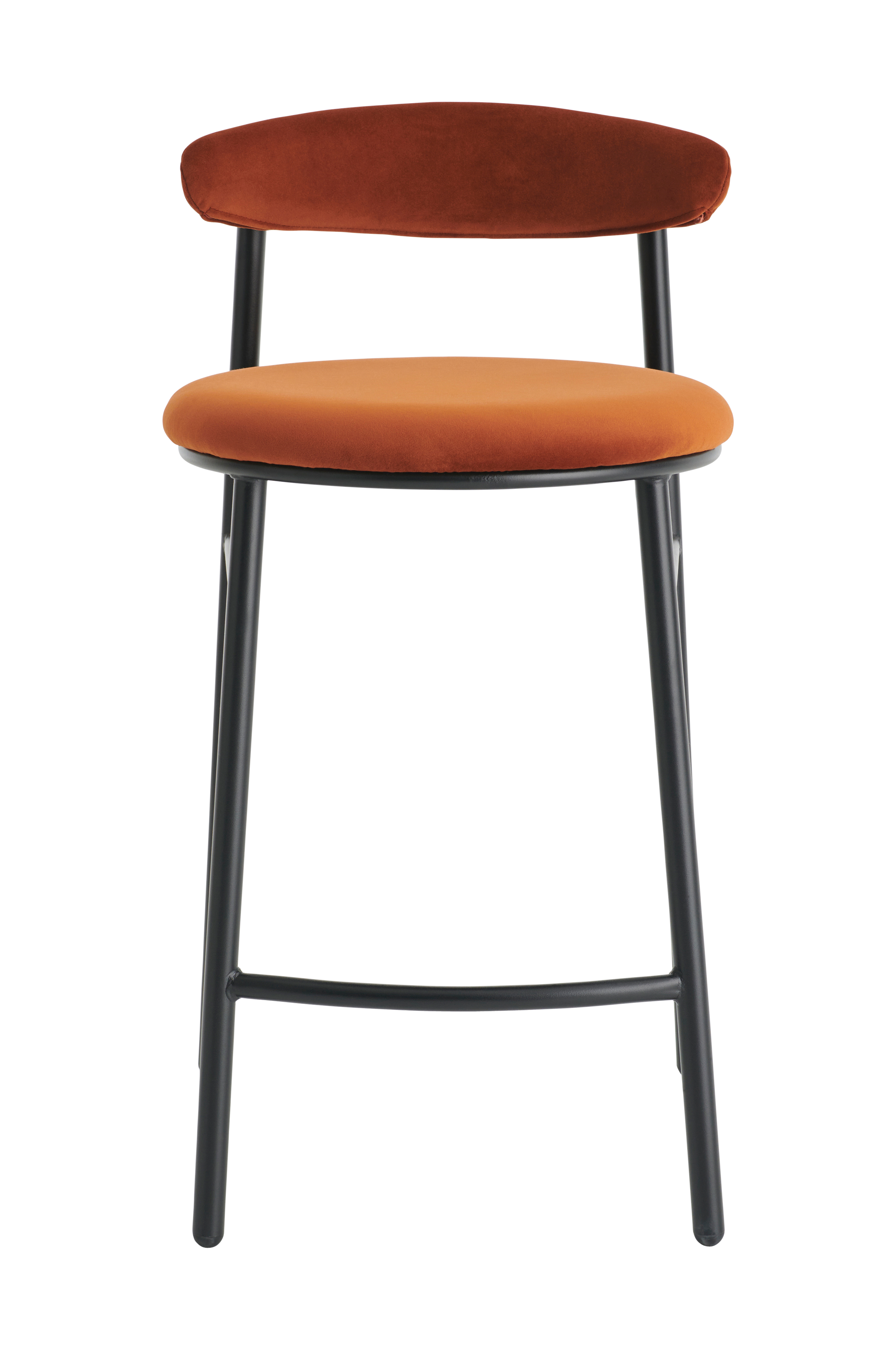Barstol i moderne design med rundt sete og buet rygg. Stamme og ben i metall. Sete og rygg med skumfyll. Fotstøttens høyde 22 cm.