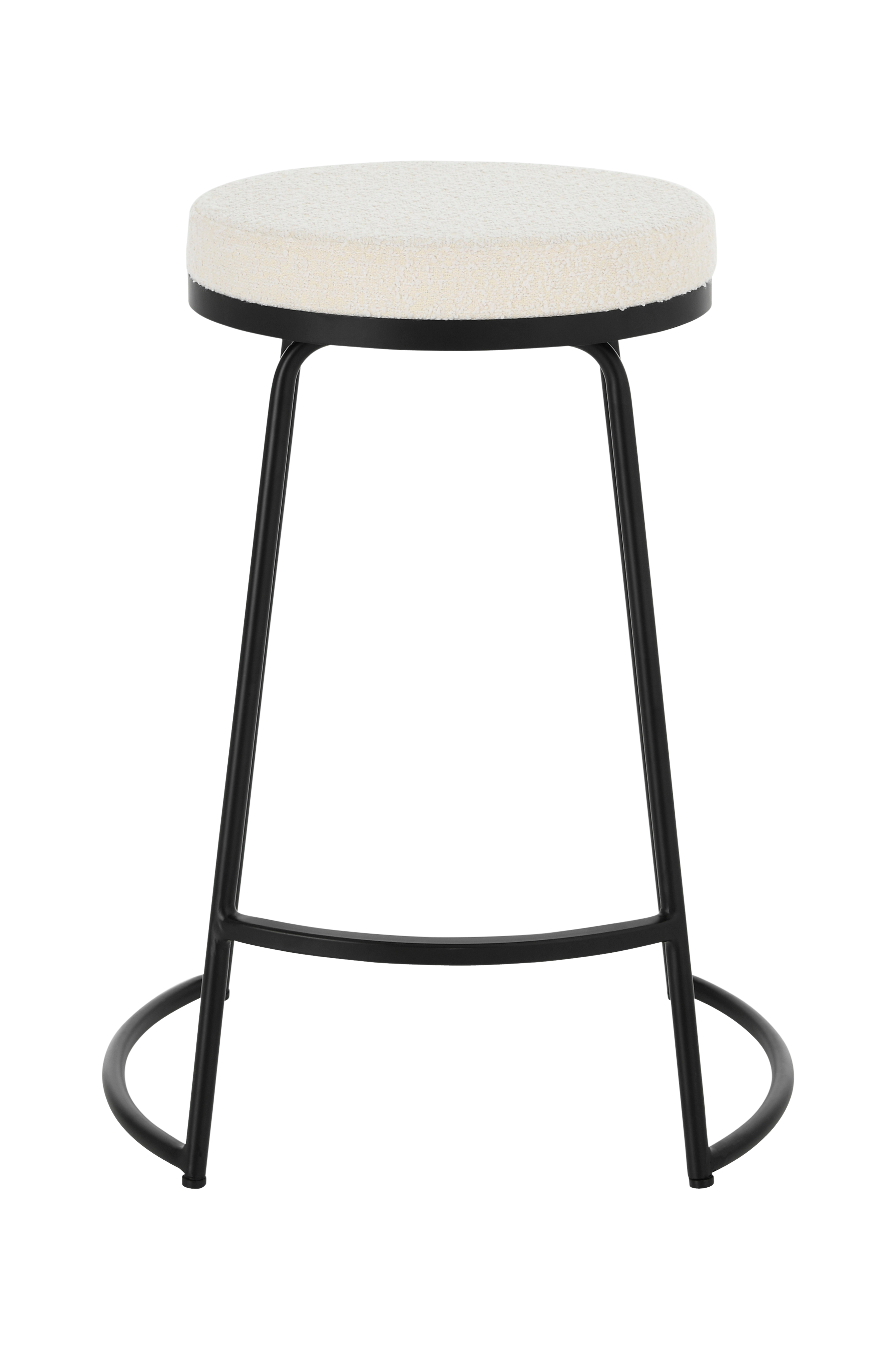 Barstol med ben i pulverlakkert metall og vattert sete med trekk i boucléstoff. Høyde til fotstøtte 16 cm. Leveres montert.