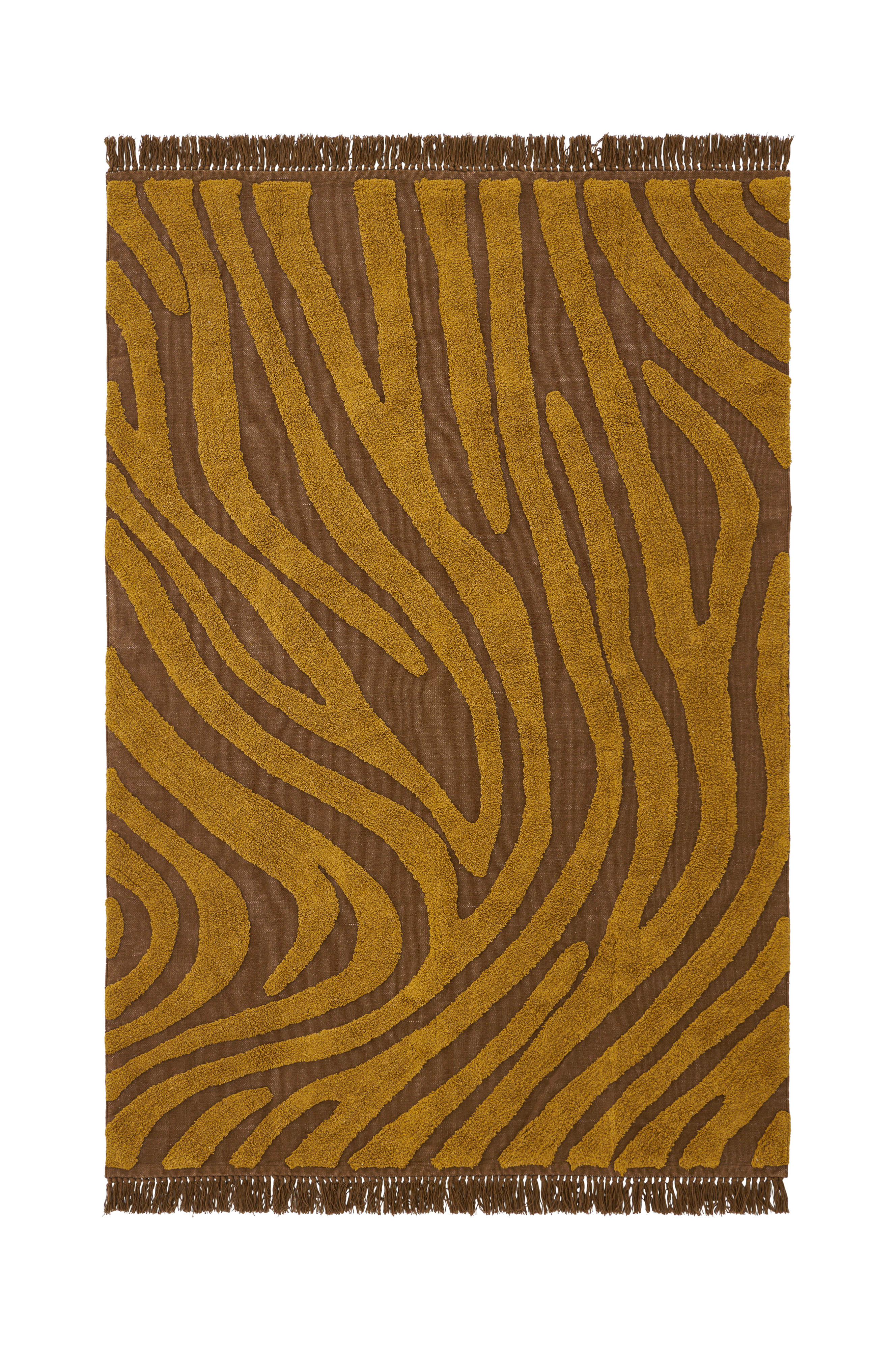 Et brunt fint, koselig teppe. Litt vondt å støvsuge og mønsteret, gulbrun lo kommer litt av. Sitter sånn på støvsugerdysen.