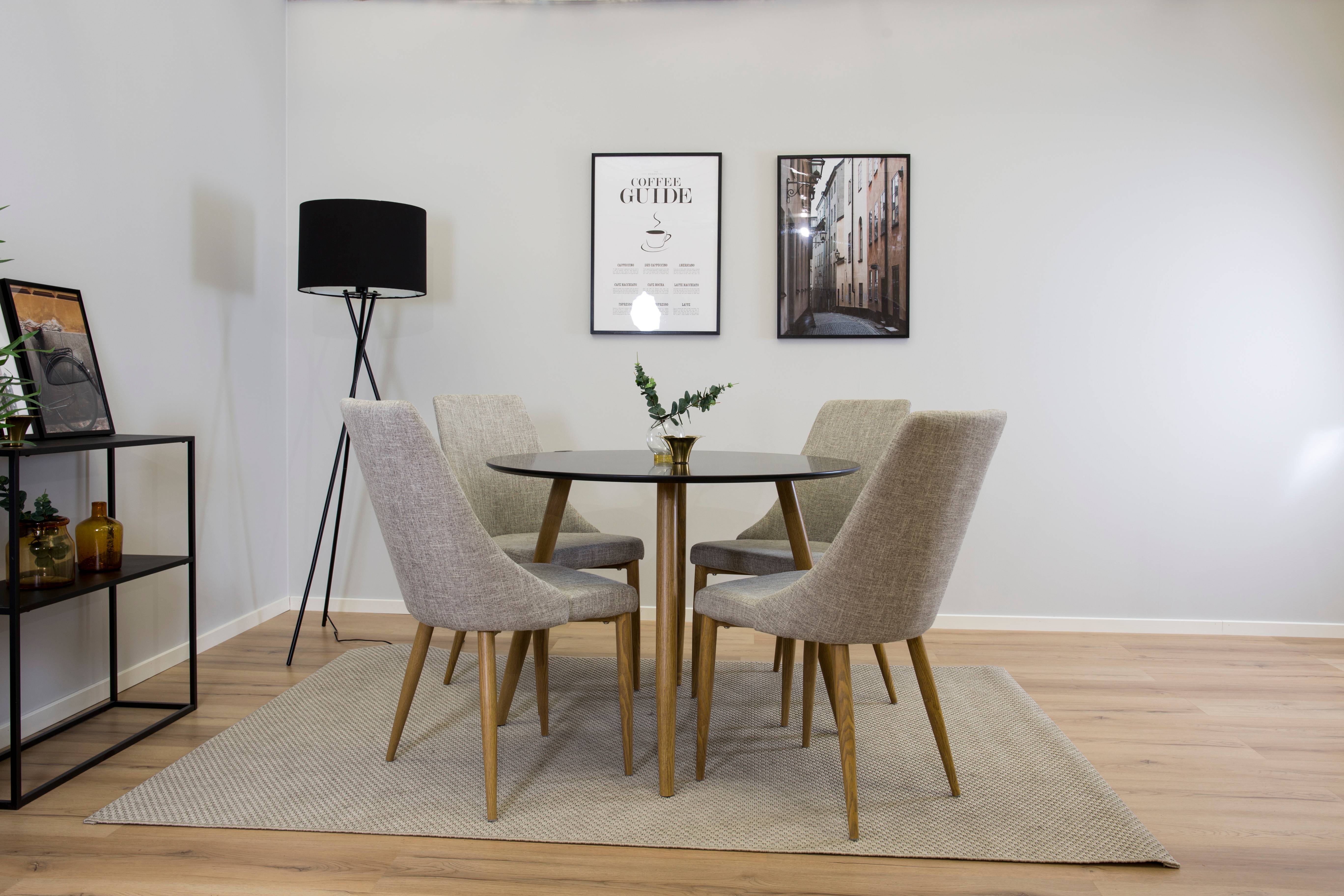 Hyggelig spisebord med svart bordplate og metallben med eike-look. Diameter: 100 cm. Høyde: 75 cm