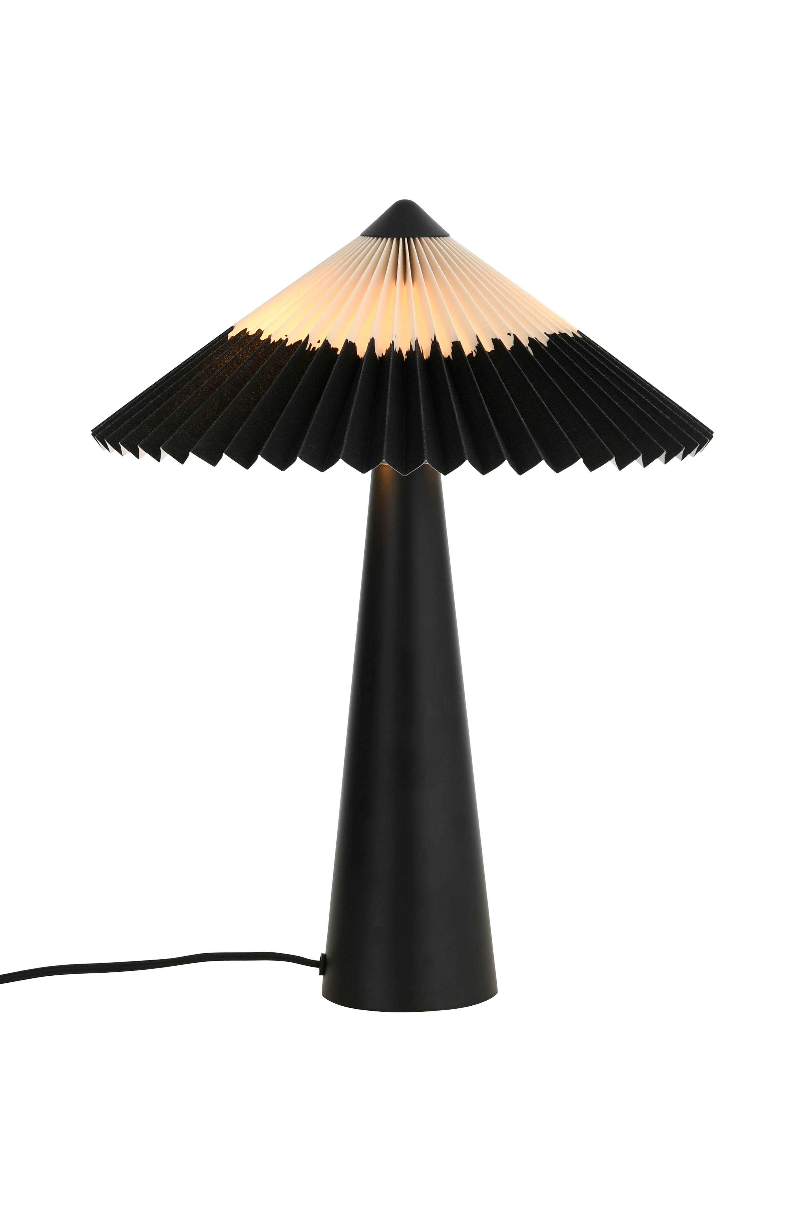 Bordlampe med skjerm i plissert tekstil og fot av metall. Skjermens mål: Diameter 35 cm, høyde 15 cm. Lampefotens mål: Diameter bunn 10 cm, høyde 30 cm. Svart ledning med strømbryter, ledningslengde 200 cm. Sokkel 2x E14. Lyspære er ikke inkludert.