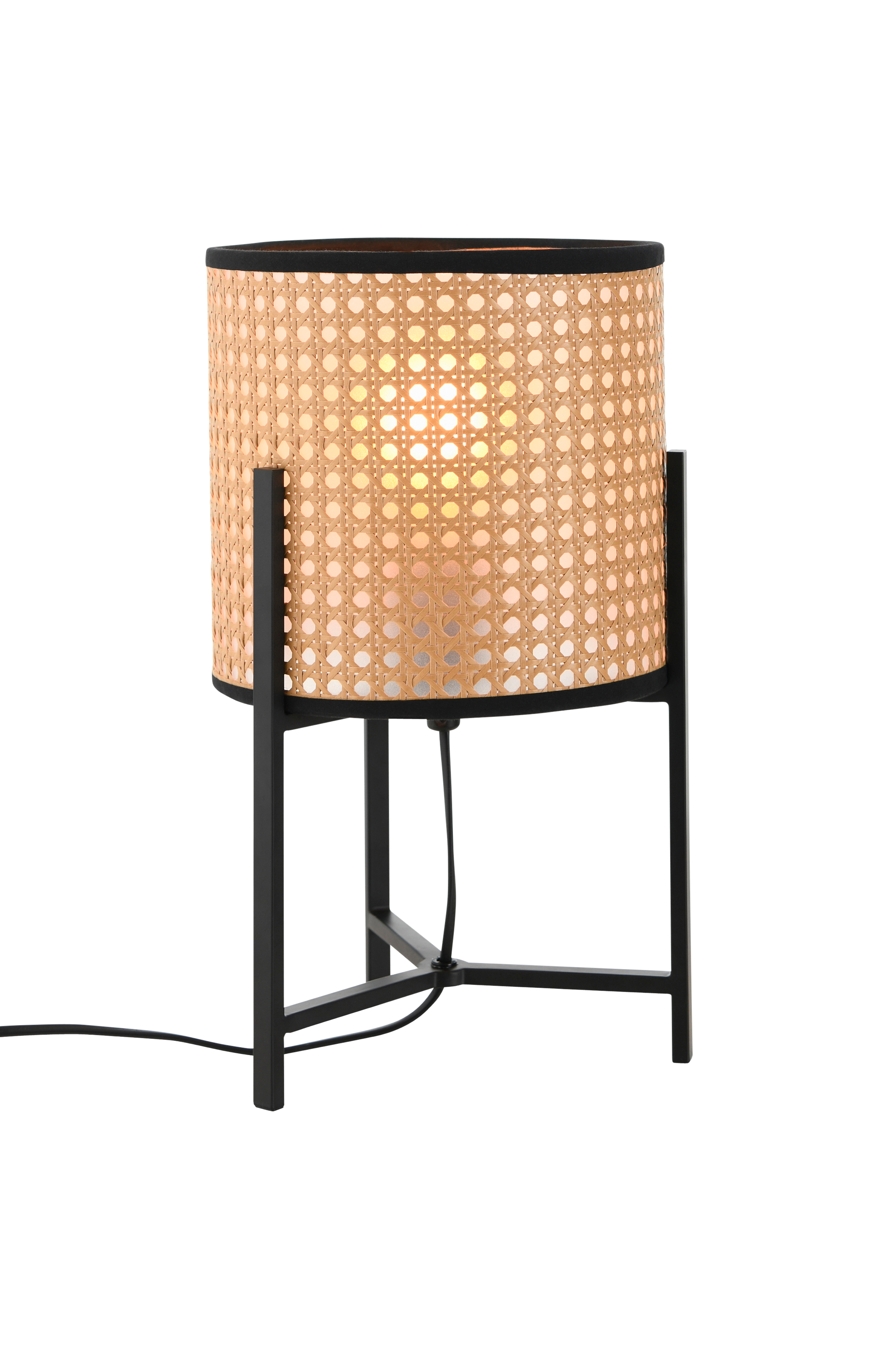 Bordlampe med skjerm av naturfarget kunstrotting og stamme av metall i mattsvart finish.