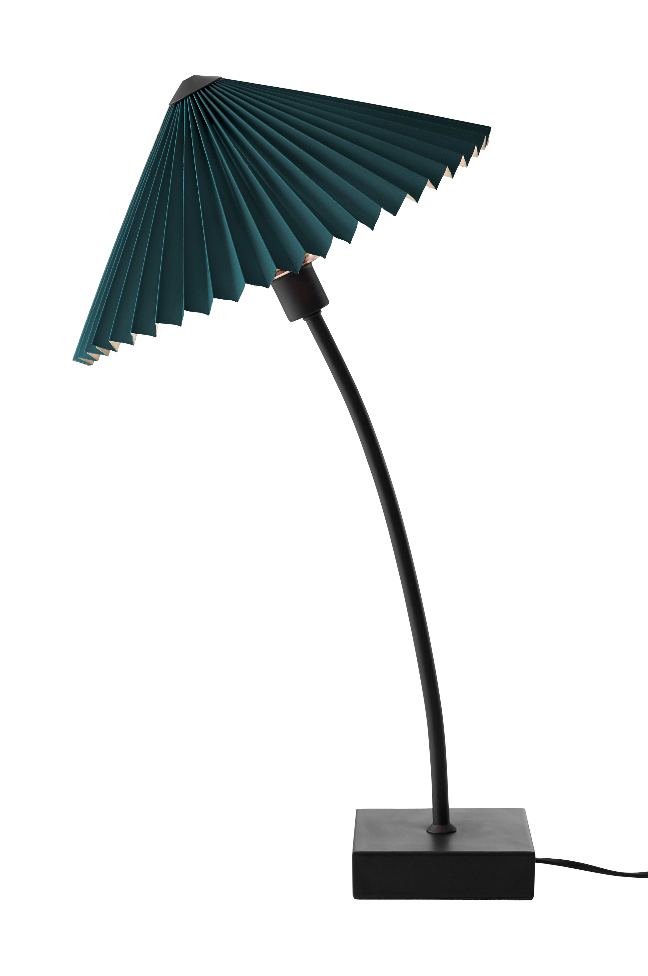 Bordlampe av metall i matt finish og plissert skjerm av papir. Total høyde 50 cm. Dybde 30 cm. Skjermens mål: Ø 30 cm, høyde 15 cm. Bunnplatens mål: 28x28 cm, høyde 3 cm. Svart plastledning med strømbryter, ledningslengde 2 m. Sokkel E14. Maks. 5 W. Lyspære er ikke inkludert.