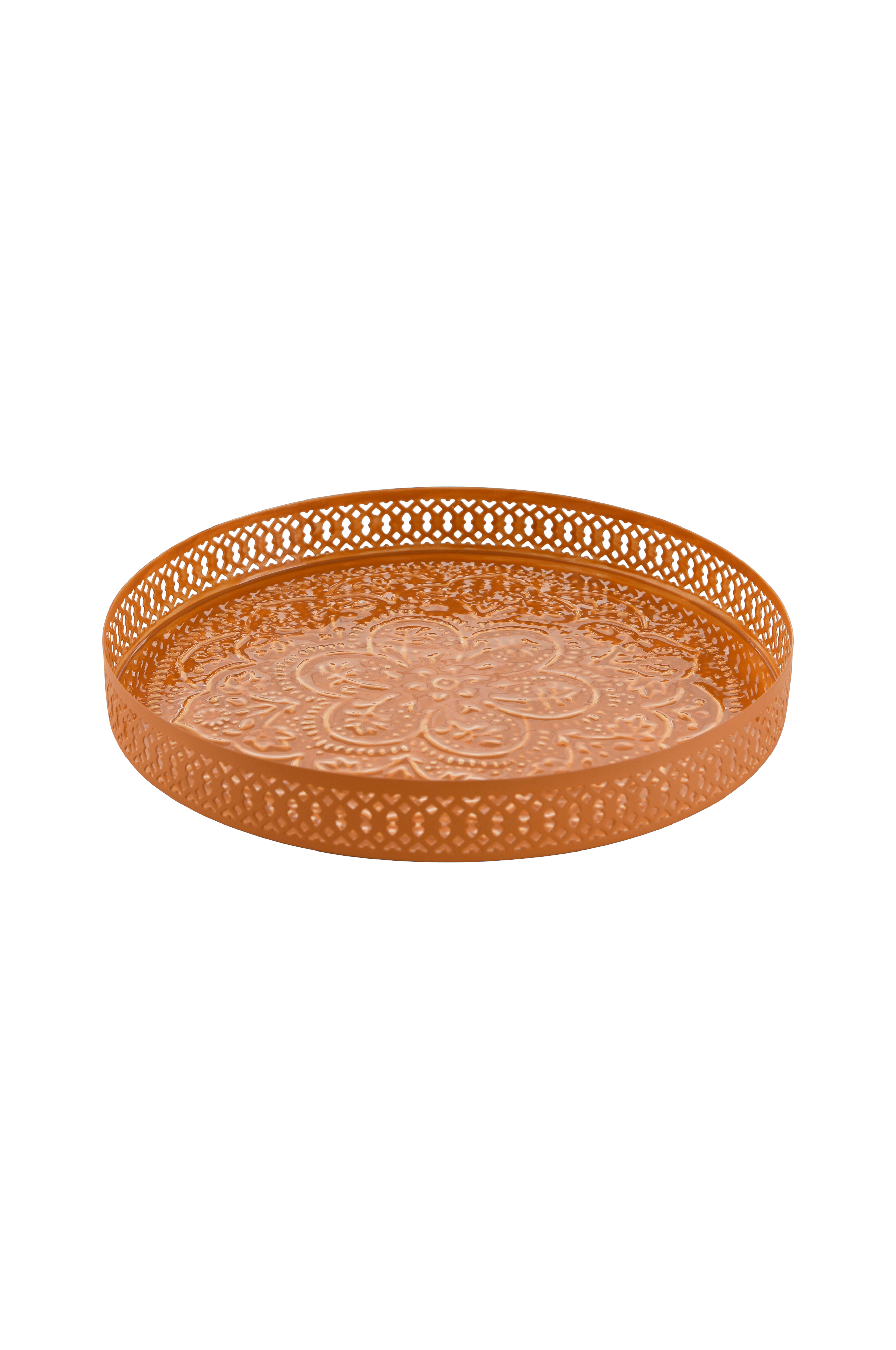 Brett av metall med relieffmønster i bunnen og utstanset mønster på kanten.