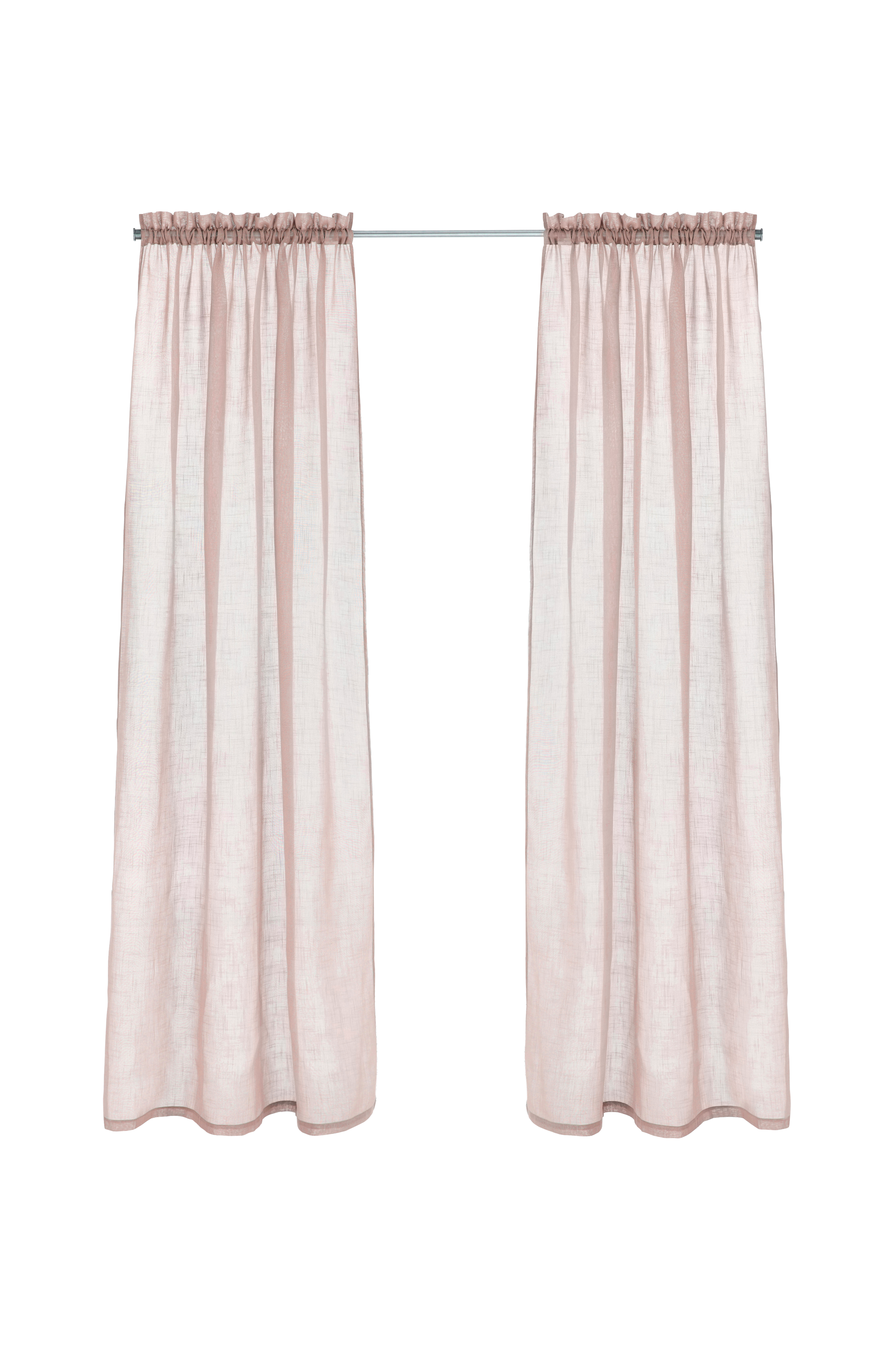 To gardiner med løpegang av tynn polyester med tekstur i linlook. 5 cm rynkehode. Bredde 134 cm. To lengder: 220 og 250 cm.