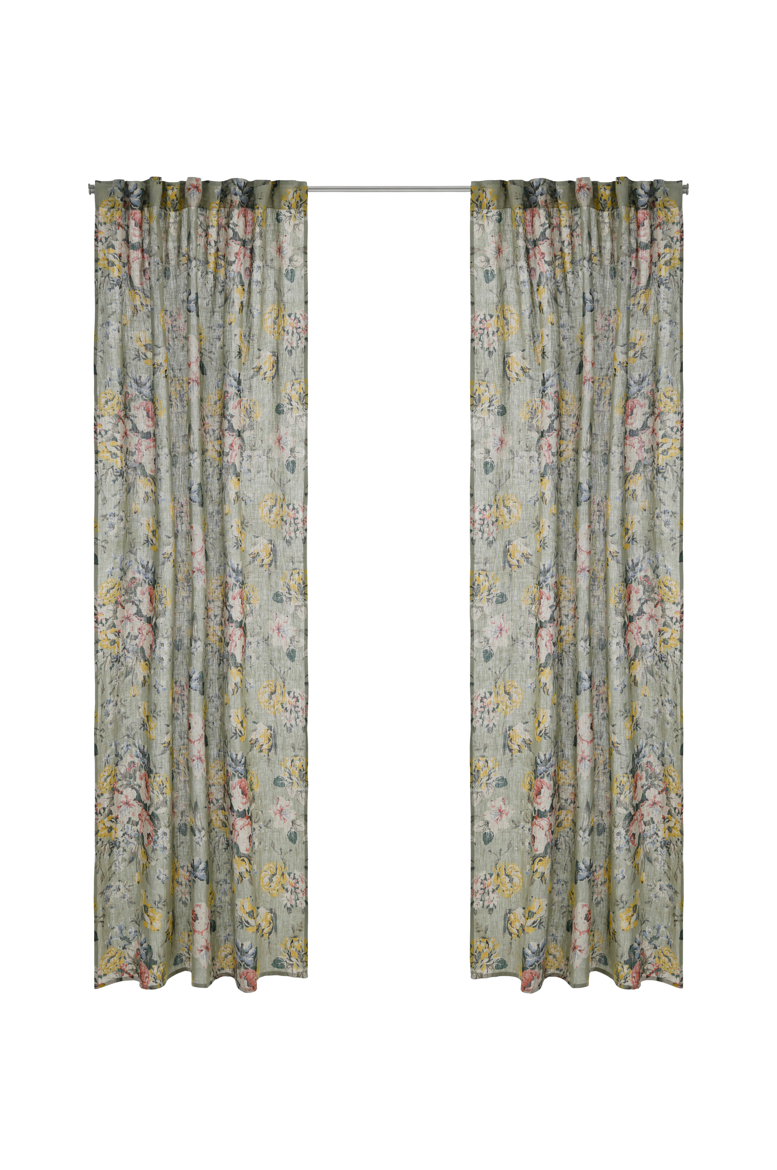 To gardiner med multibånd i vasket fransk lin med trykt mønster. Bredde 140 cm.