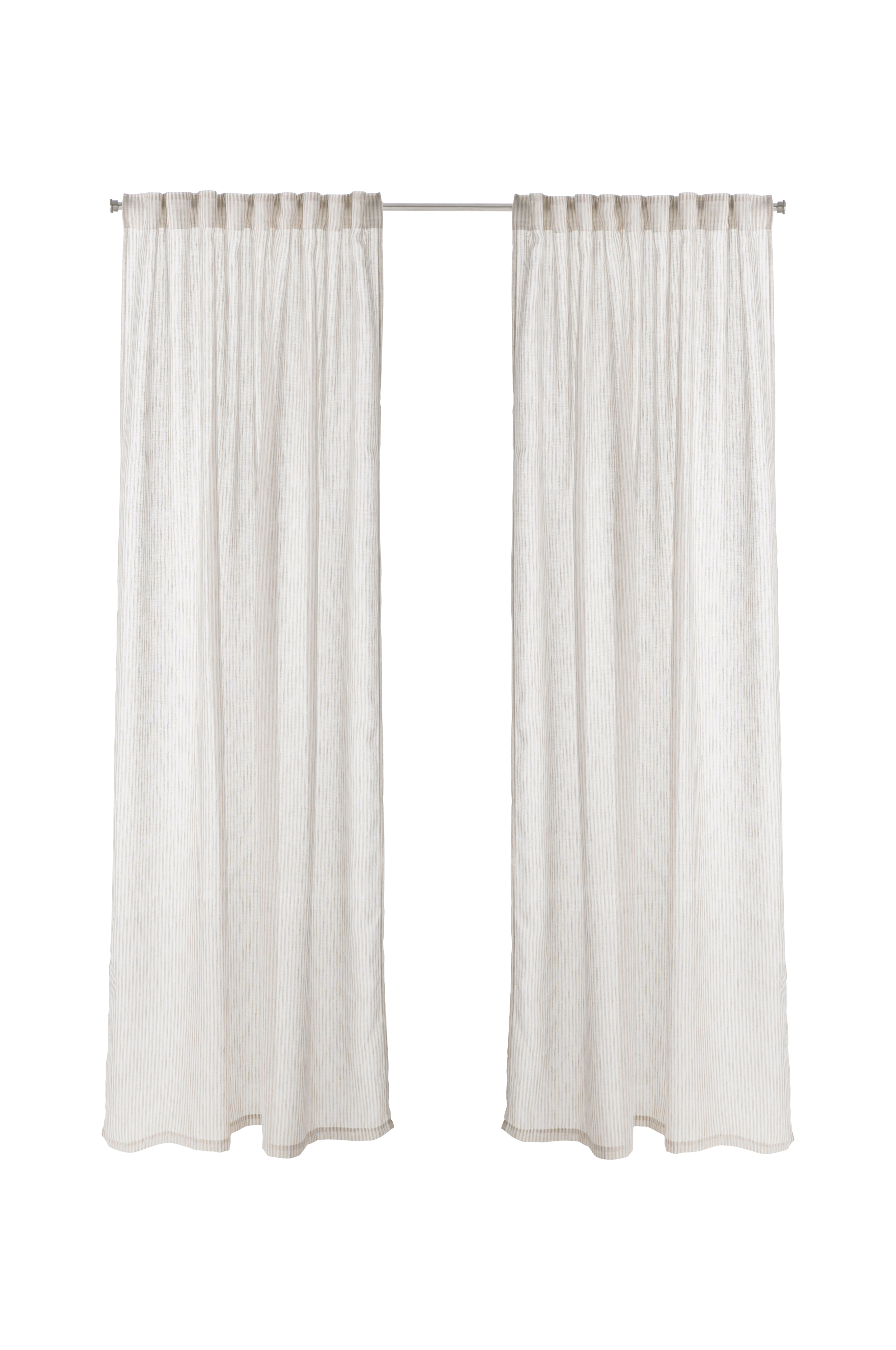 To gardinlengder med multibånd i luftig vevd polyester med garnfargede striper. Multibåndet gjør at du enten kan henge gardinene rett på en gardinstang gjennom de skjulte hempene eller bruke ringer, nålkroker eller fingerkroker. Snoren i rynkebåndet gjør at du lett kan skape jevne, fine folder. Bredde 140 cm. Gardiner finnes i tre lengder: 220, 250 og 300 cm.