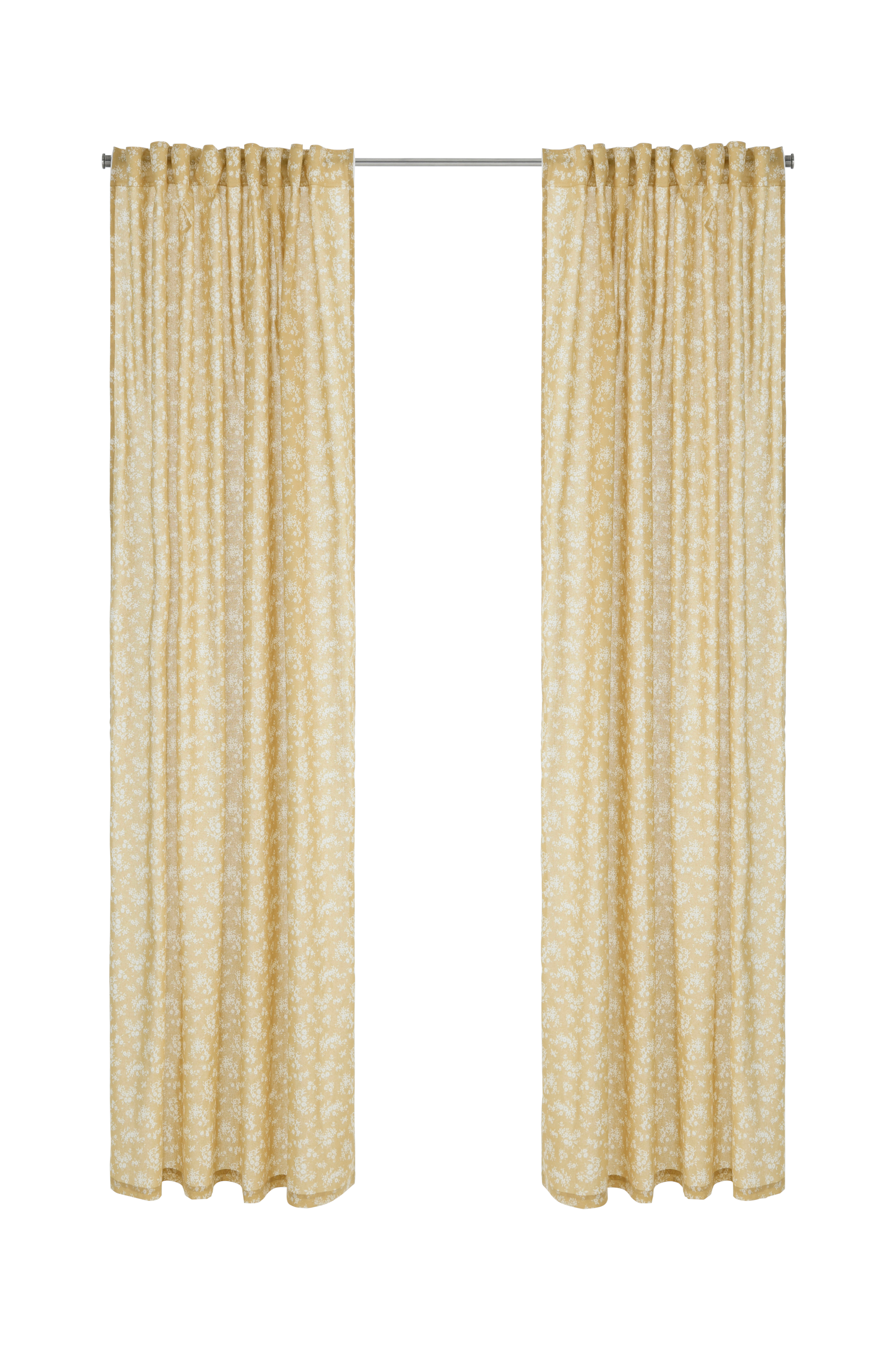 To gardinlengder med multibånd i lett bomullskvalitet med trykt mønster. Multibåndet gjør at du enten kan henge gardinene rett på en gardinstang gjennom de skjulte hempene eller bruke ringer, nålkroker eller fingerkroker. Snoren i rynkebåndet gjør at du lett kan skape jevne, fine folder.
