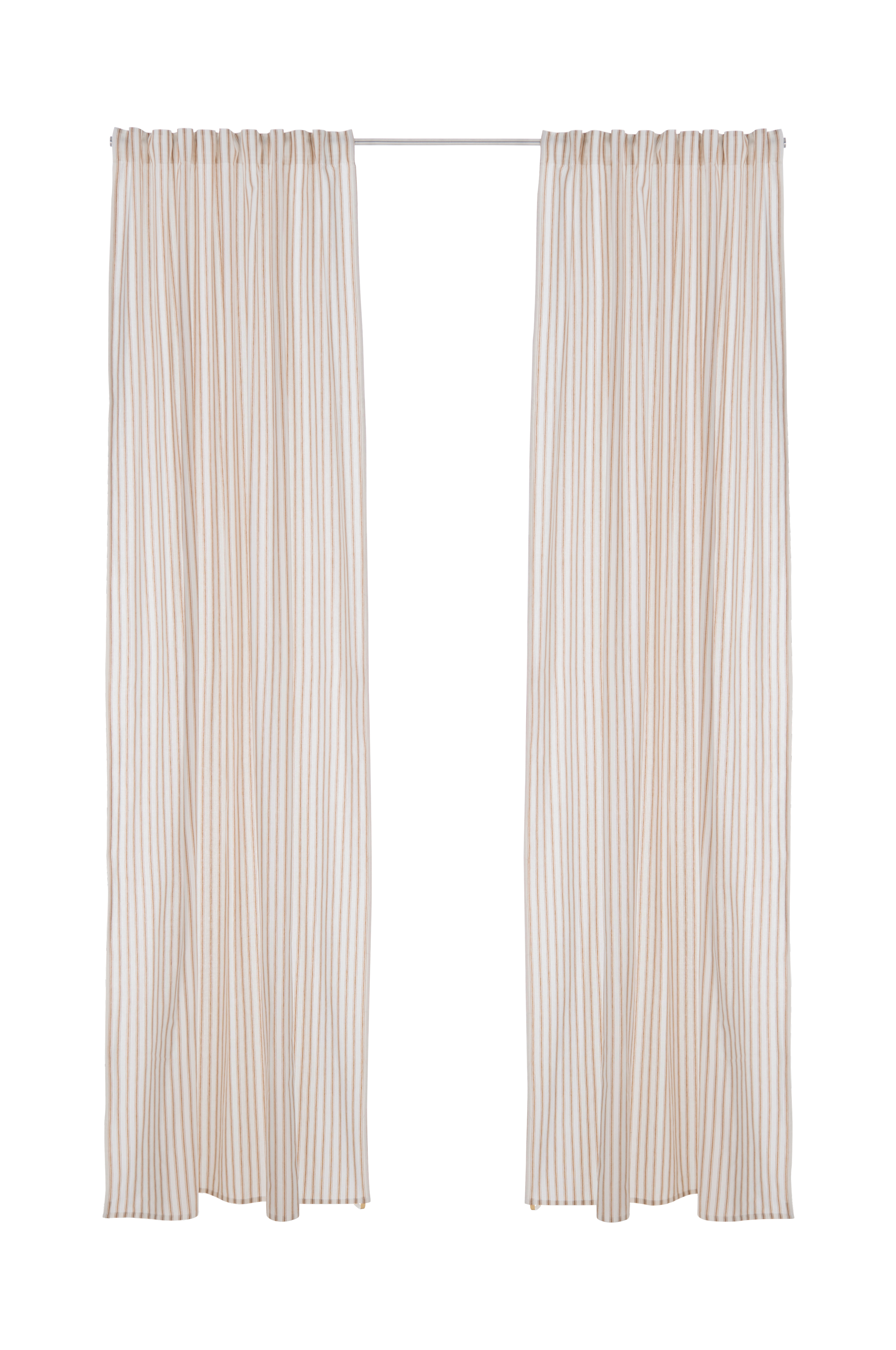 To gardiner med multibånd i økologisk bomull med garnfarget stripe. Multibåndet gjør at du kan bruke enten ringer, nålkroker eller fingerkroker. Bredde 140 cm. Tre lengder: 220, 250 og 300 cm.