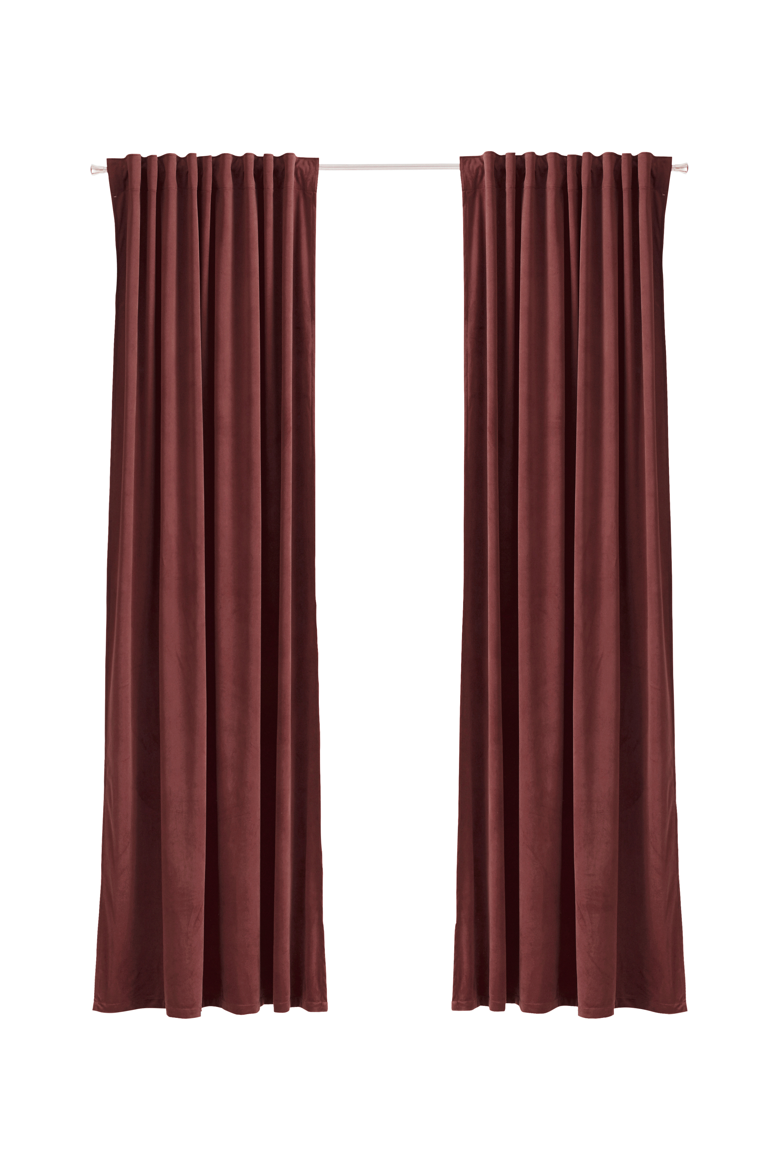 To gardiner i fløyel med multibånd, fin glans og mykt fall. Multibåndet gjør at du enten kan henge gardinene rett på en gardinstang gjennom de skjulte hempene eller bruke ringer, nålkroker eller fingerkroker. Snoren i rynkebåndet gjør at du lett kan skape jevne, fine folder. Bredde 140 cm. Tre lengder: 220, 250 og 300 cm.