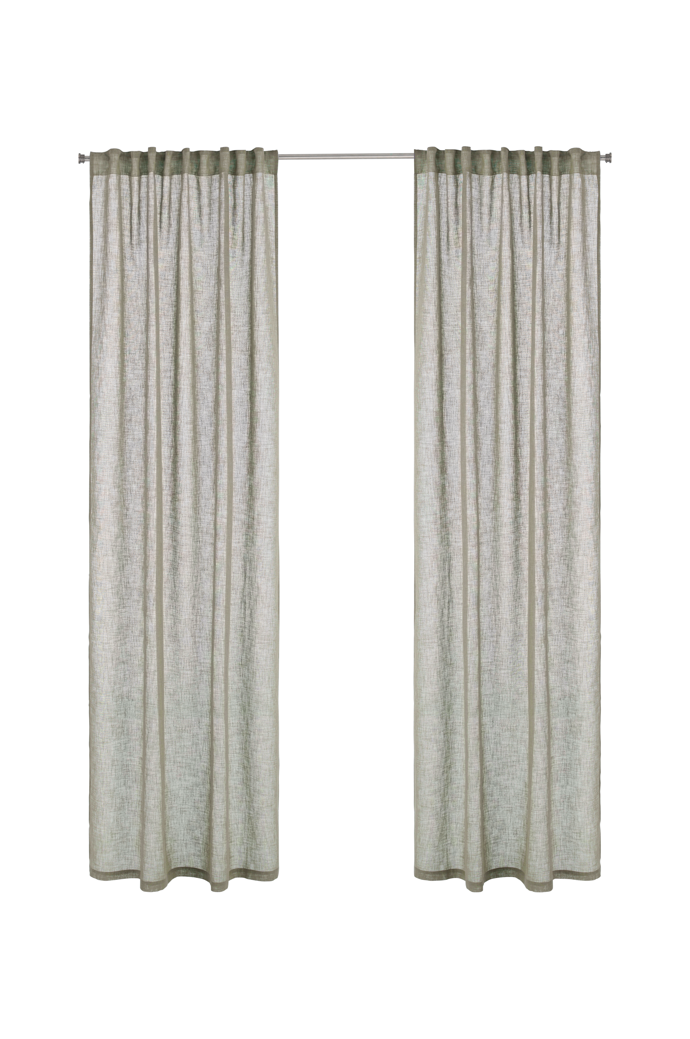 To gardinlengder av polyester med multibånd i luftig vevd tekstur med linlook. Matt finish. Multibåndet gjør at du enten kan henge gardinene rett på en gardinstang gjennom de skjulte hempene eller bruke ringer, nålkroker eller fingerkroker. Snoren i rynkebåndet gjør at du lett kan skape jevne, fine folder. Bredde 135 cm. Tre lengder: 220, 250 og 300 cm.
