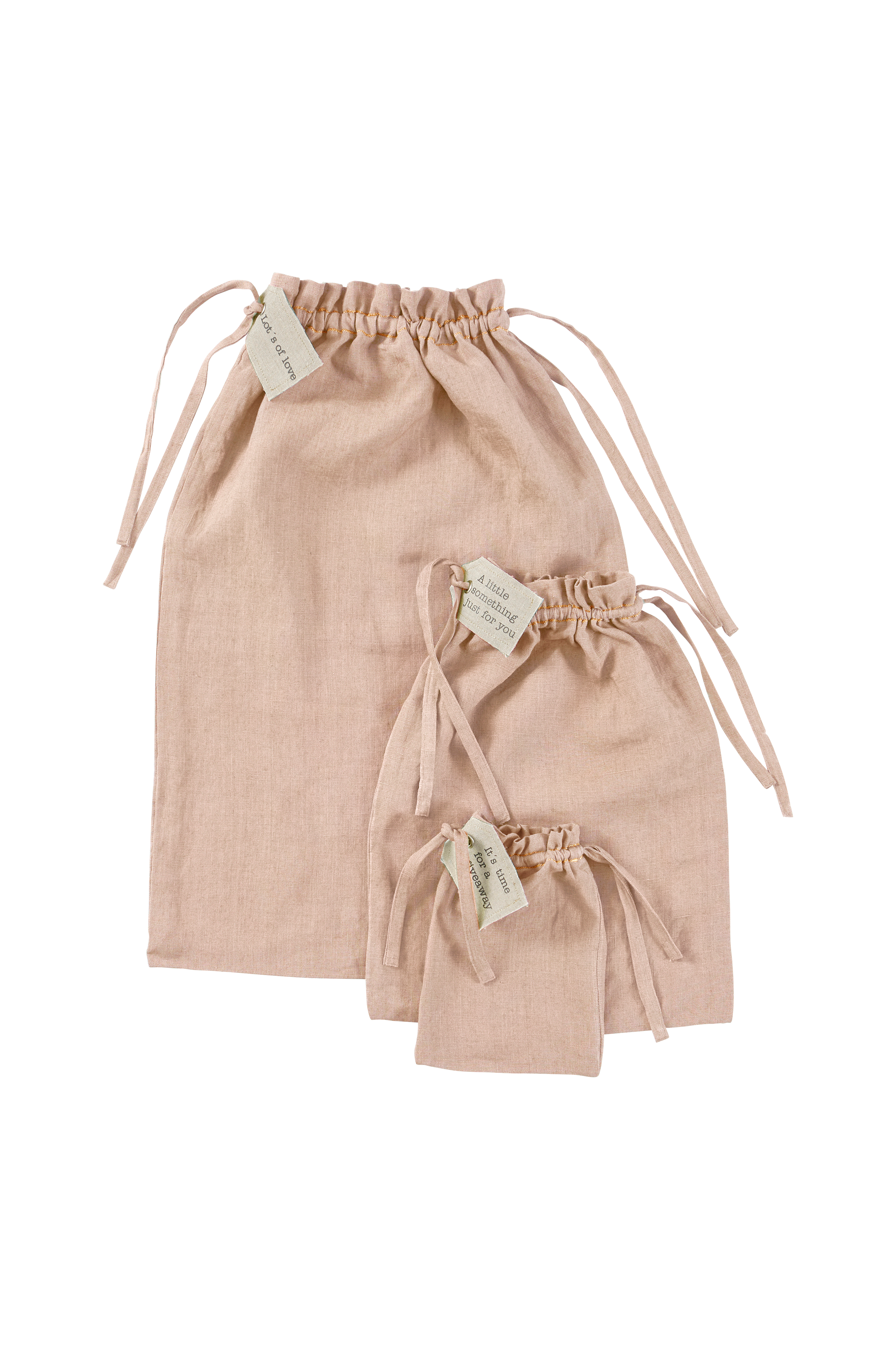 Gavepose Candice i linstoff. Snøring med etikett øverst. Velg mellom str 15x20 cm, 30x40 cm og 40x60 cm.