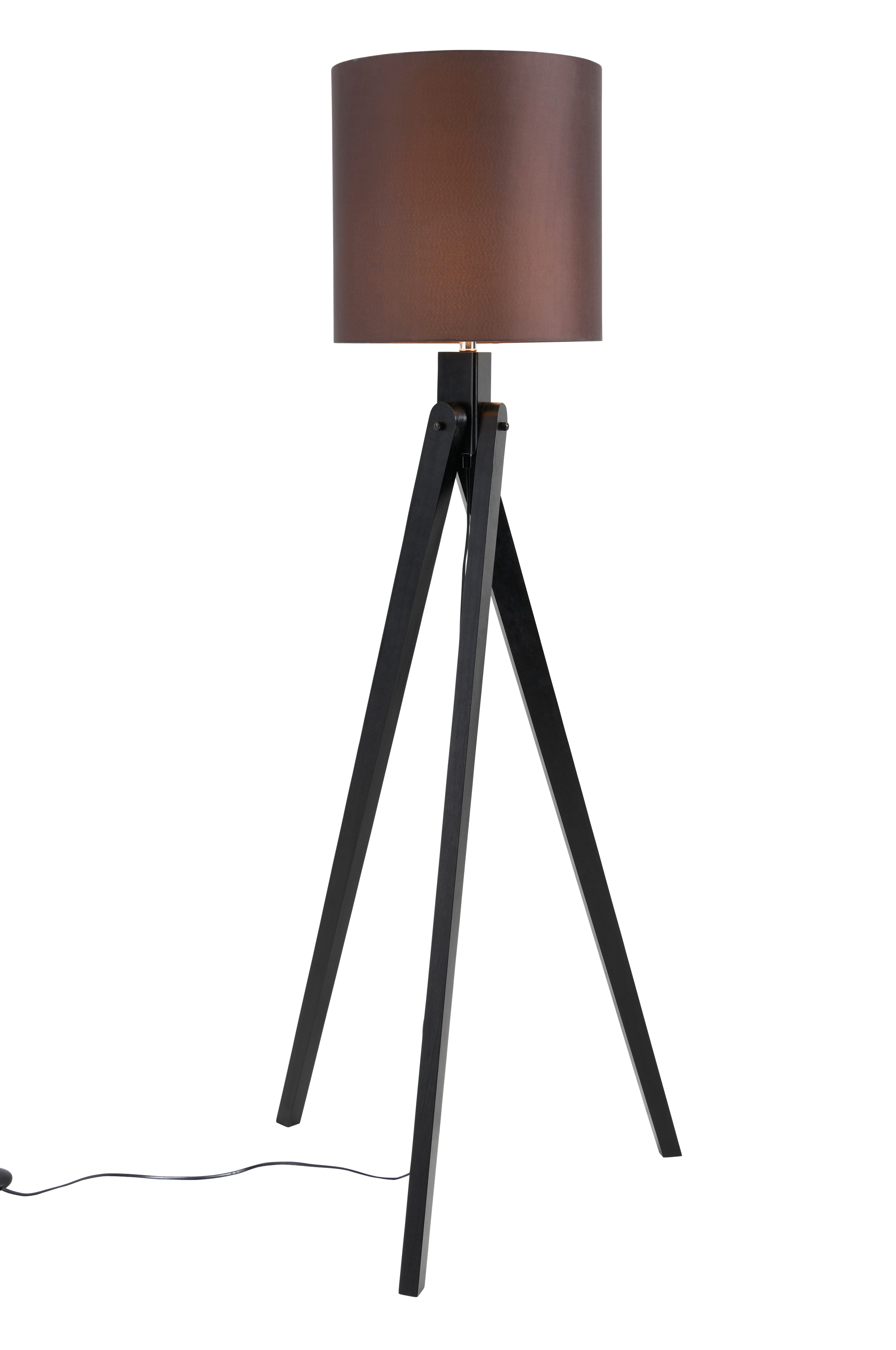 Gulvlampe med 3 ben av svartbeiset tre. Sylinderformet tekstilskjerm. Skjermens mål: Diameter 40 cm, høyde 40 cm. Gulvdiameter 50 cm. Ledning med gulvstrømbryter. Lyspærer er ikke inkludert.