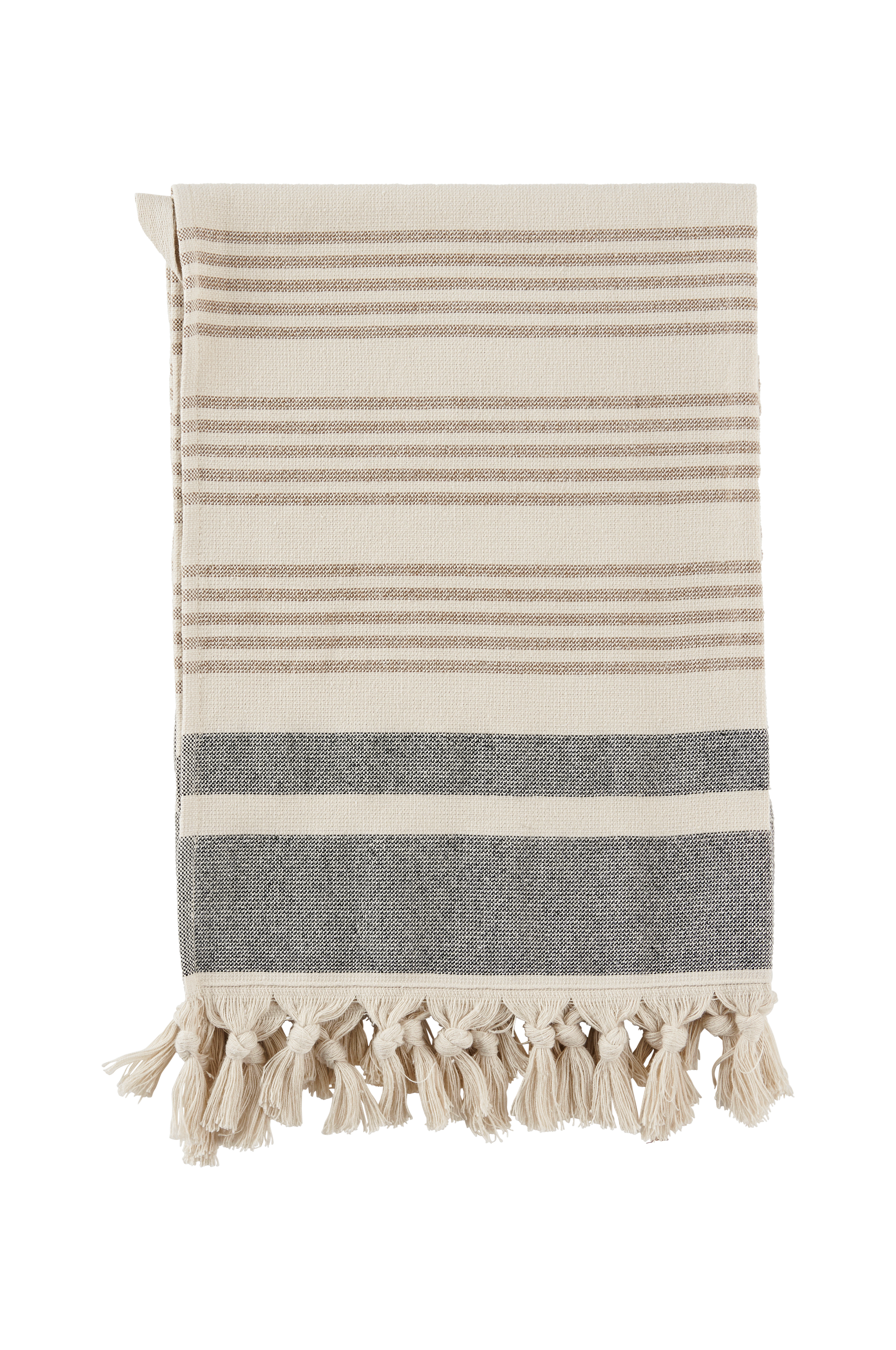 Hamamhåndkle i bomull med glattvevd framside og bakside i frotté. Frynser på begge kortsidene.