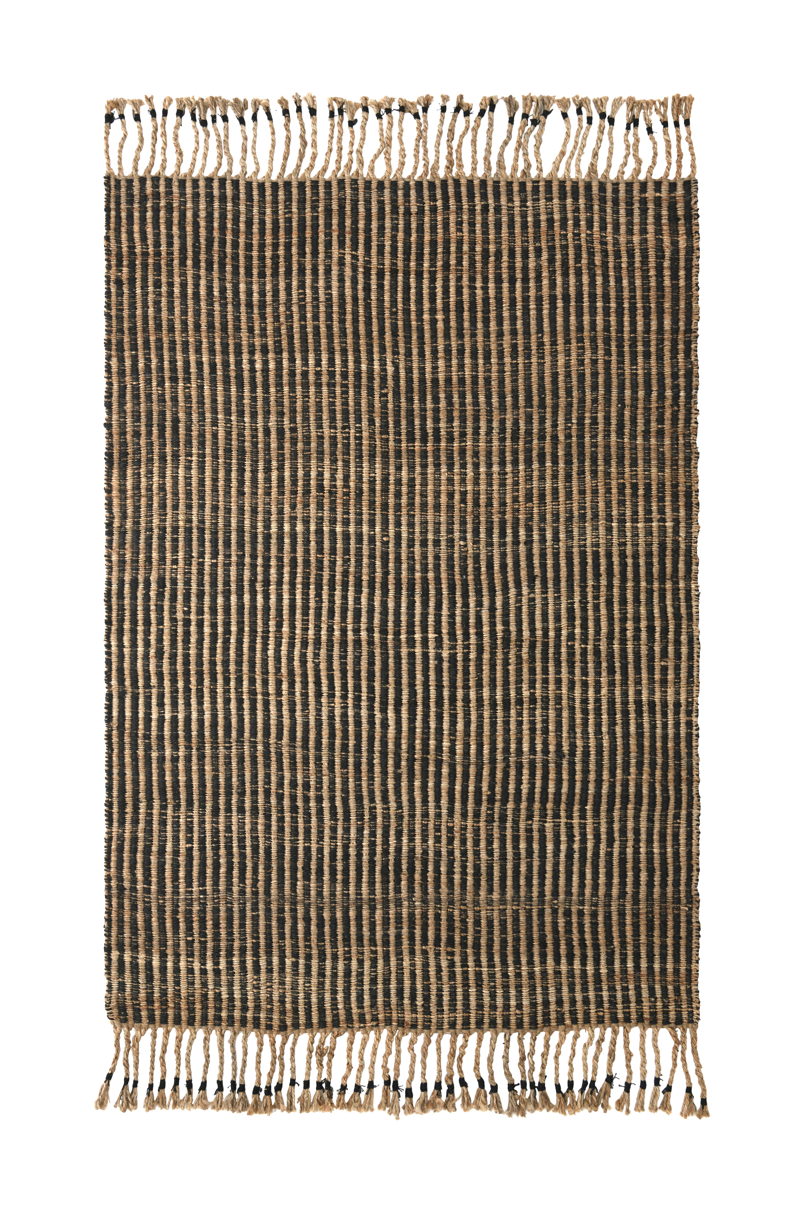 Håndvevd teppe i jute med litt grov tekstur. Varp i bomull. Tvinnede frynser på kortsidene med tvinnet bomullstråd rundt. Frynsenes lengde 25 cm. Teppets tykkelse ca. 1 cm.