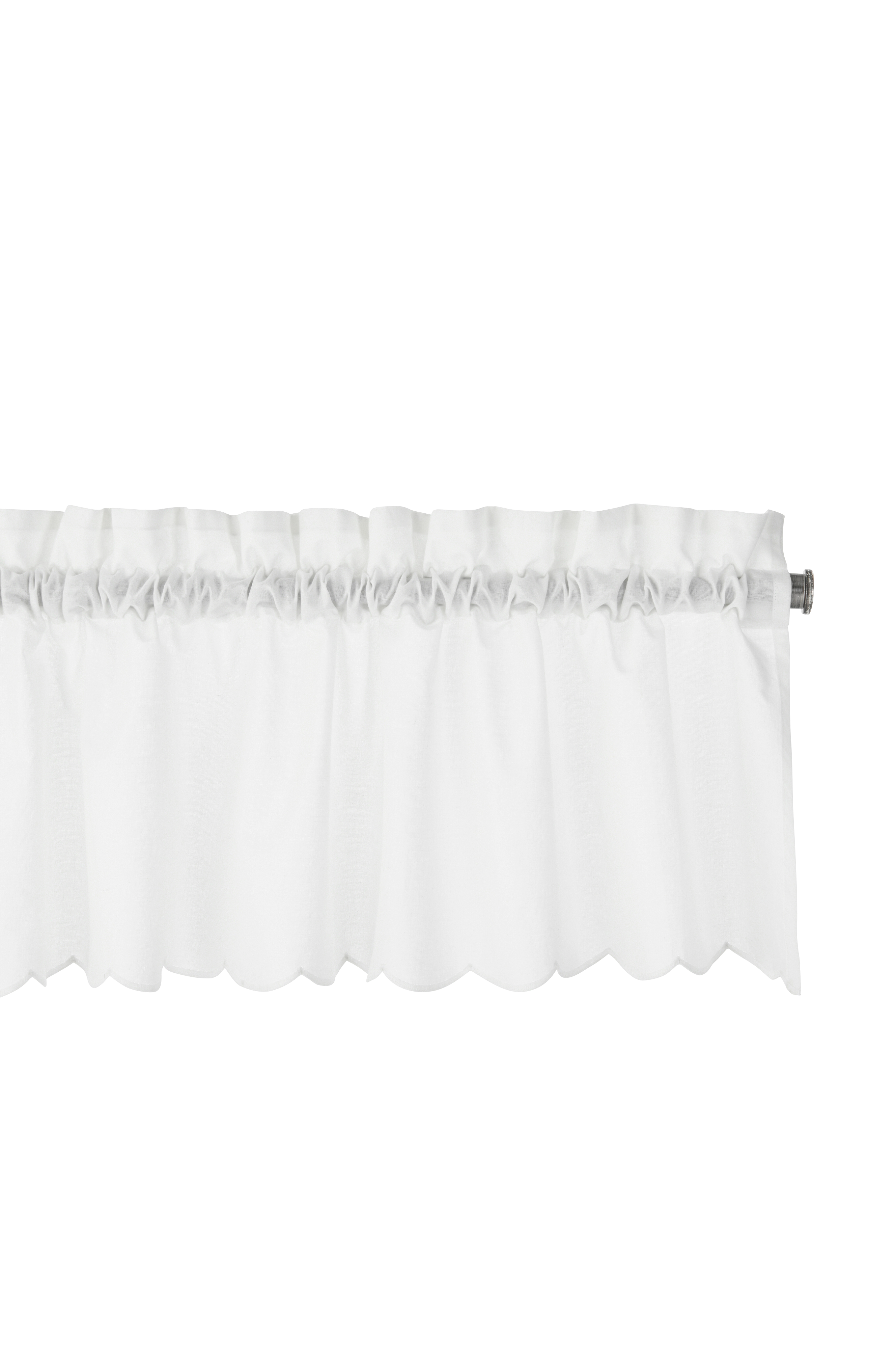 Gardinkappe i bomull. Bølgeformet nederkant med overlocksøm. Sydd løpegang øverst. Bredde 40 cm.