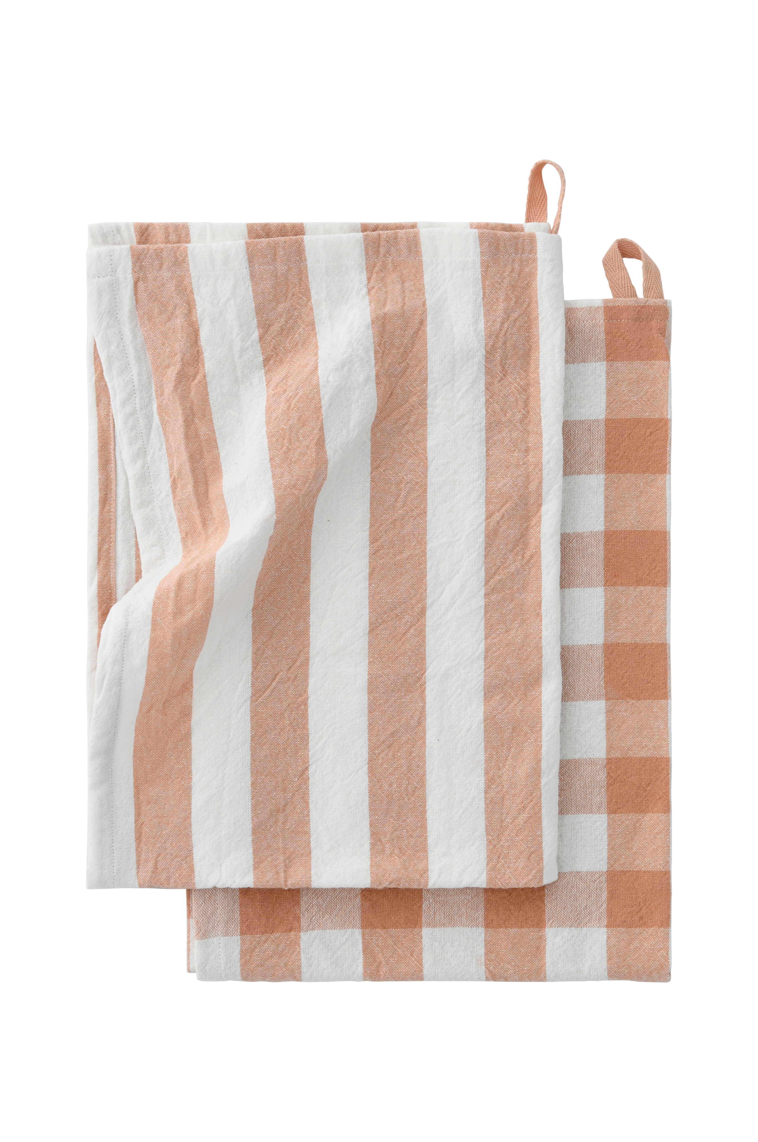 To kjøkkenhåndklær i økologisk bomull, et med vevde ruter og et med vevde striper.
