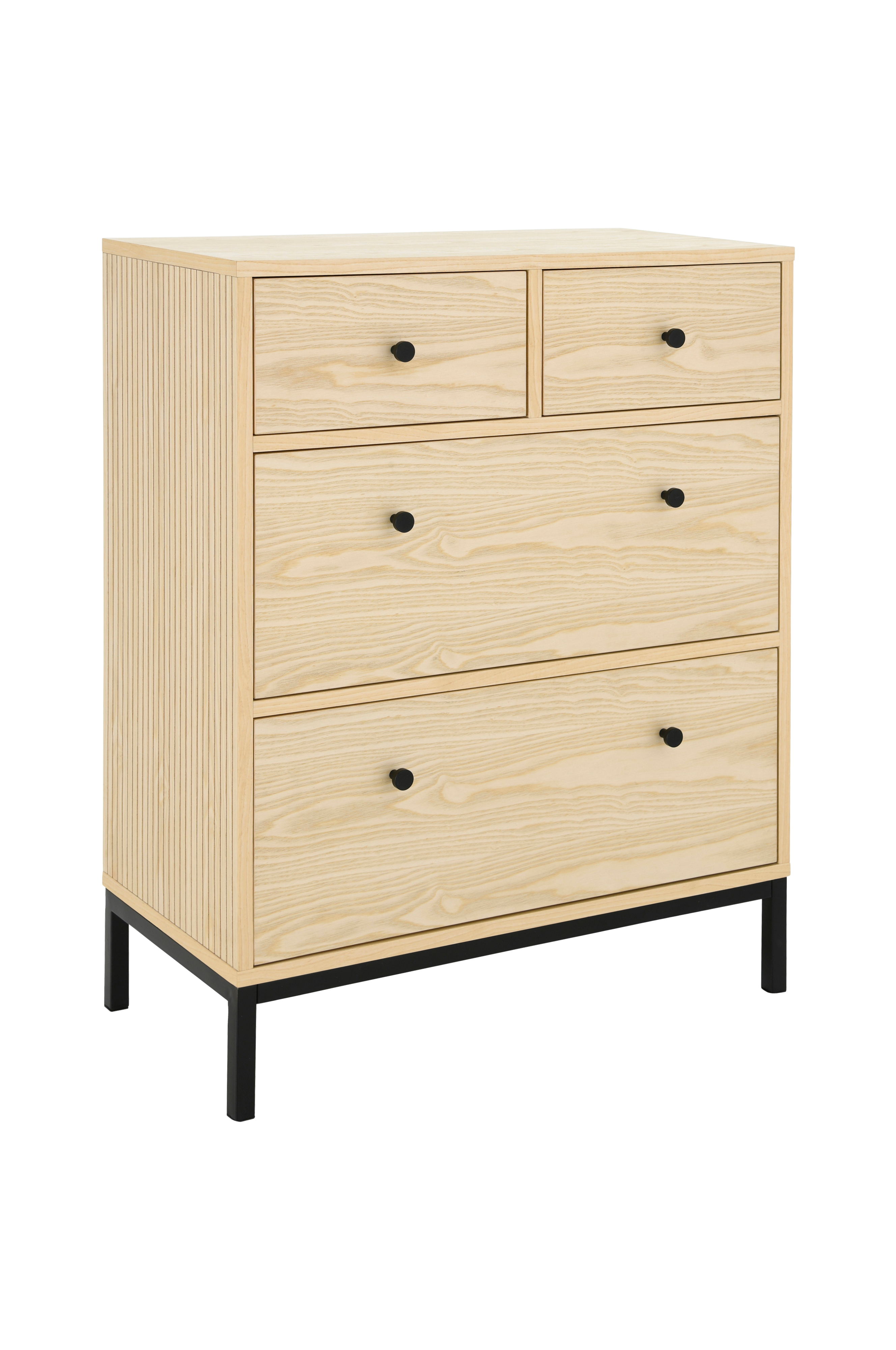 Kommode i lakkert eller askefinért MDF med frest mønster på gavlene og dekorative knotter på skuffene. 2 store og 2 små skuffer.