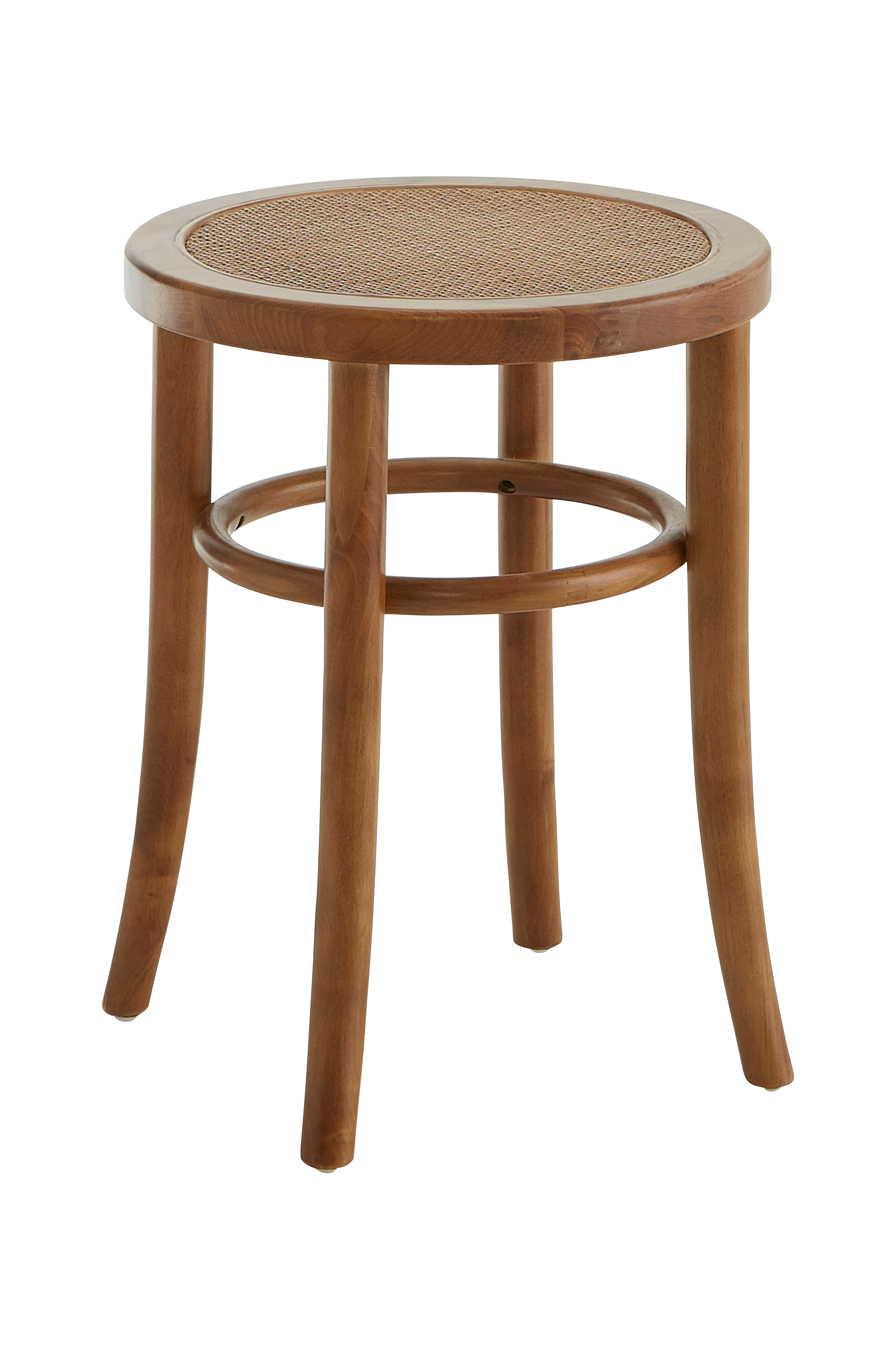 Krakk av tre med rottingsete. Høyde: 46,5 cm. Ø sete 35 cm. Sittehøyde 46,5 cm. Mål nederst 40x40 cm. Montert. Maks vekt 90 kg.