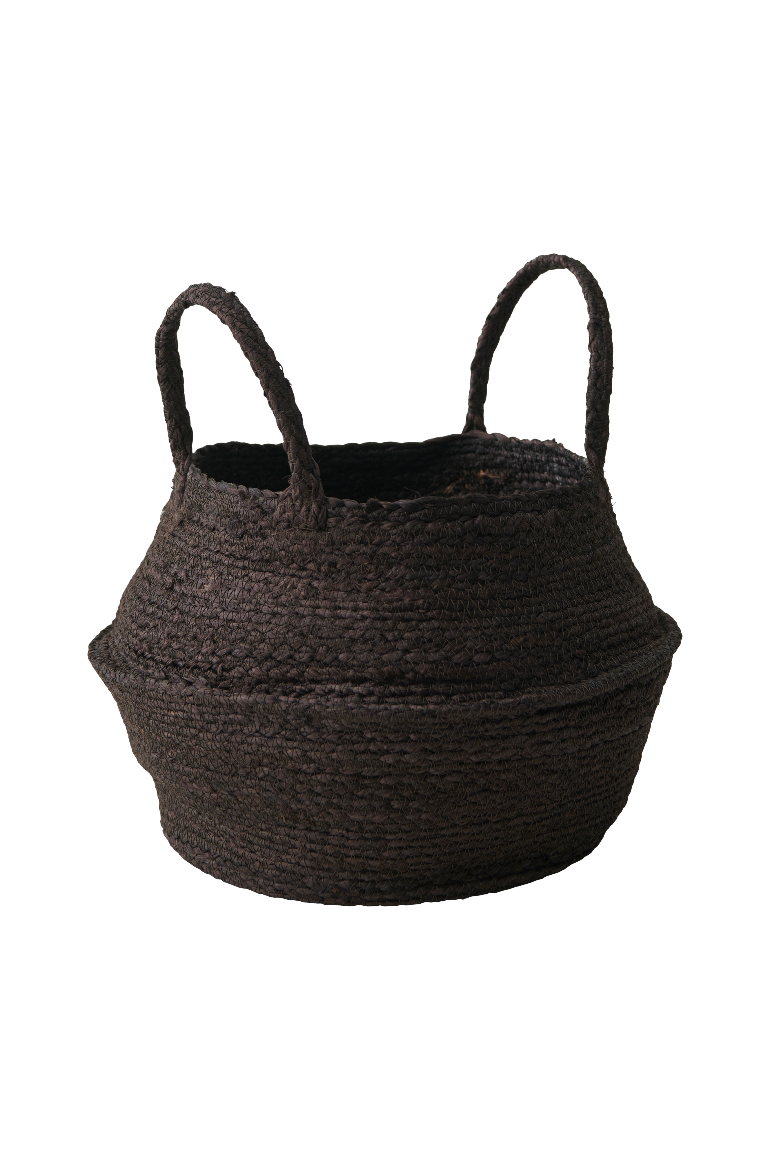 Oppbevaringskurv produsert av sjøgress med to bærehåndtak. Høyde uten håndtak 24 cm. Diameter midten 32 cm.