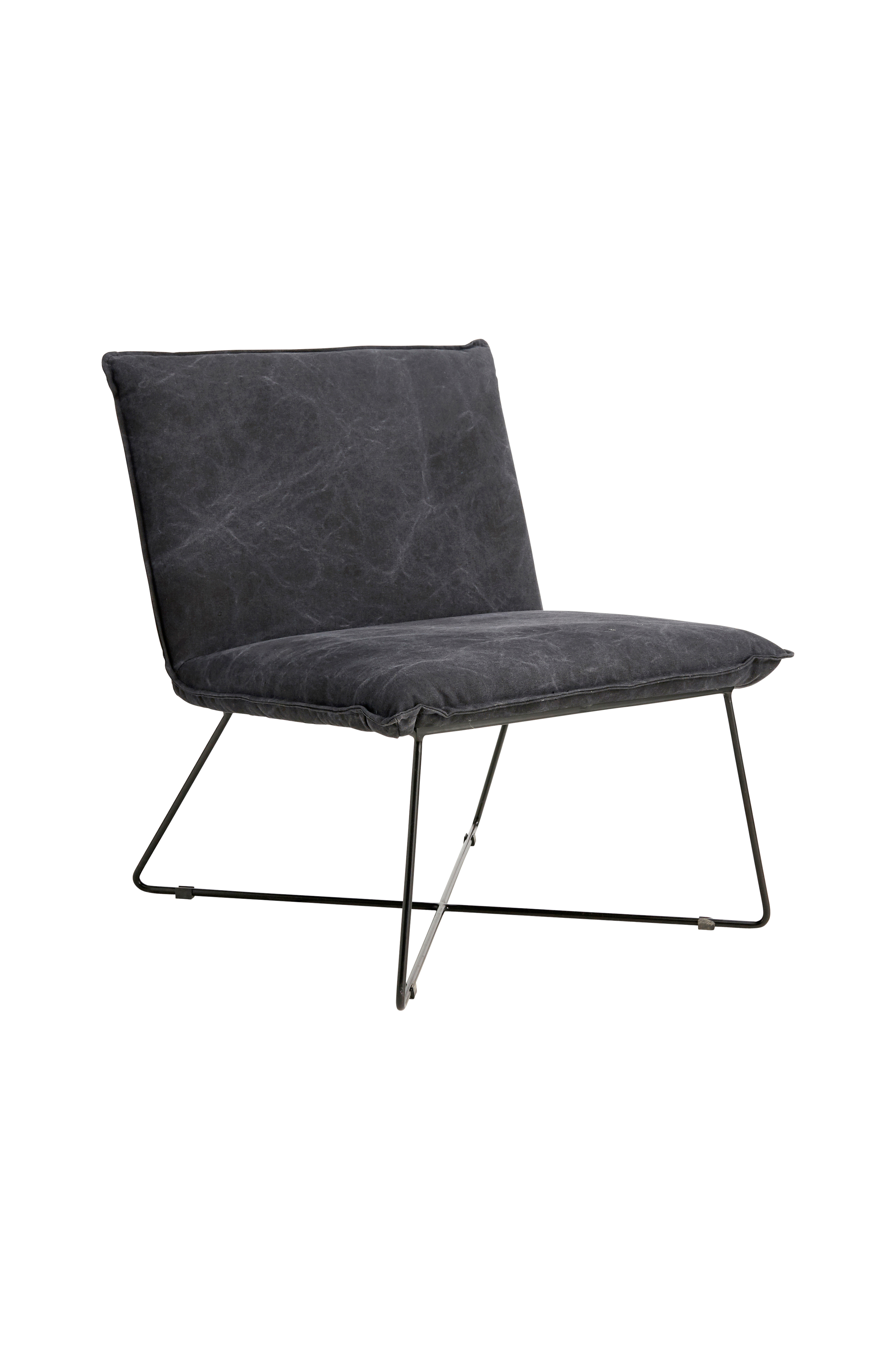 Lenestol med metallstamme og trekk i kanvasstoff. Polstring av polyeter.